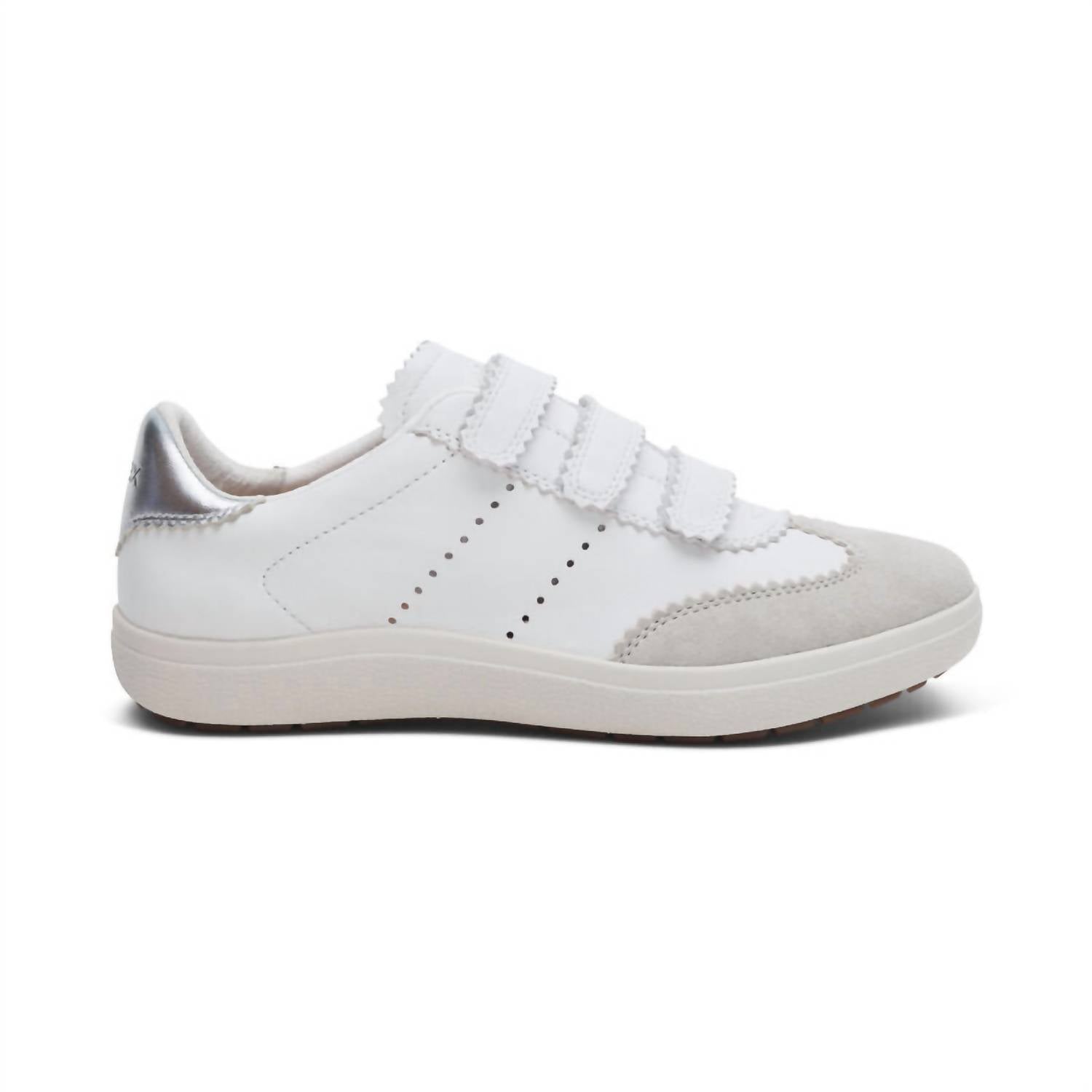 Cute, functional, and comfortable. These sneakers check all the boxes. Step into comfort and style with the Women's Morgan Arch Support Sneaker by Aetrex, a must-have for athleisure enthusiasts. Crafted from sleek white leather, this sneaker features a convenient adjustable hook & loop closure for a secure fit and a round toe shape for added comfort. It's designed with a lightweight UltraSky™ midsole and durable rubber outsole, offering superior cushioning and support perfect for game day or everyday wear. Heel height measures 1.25 inches, and each pair incorporates Aetrex's Orthotic System for enhanced foot alignment and relief from common foot pains.