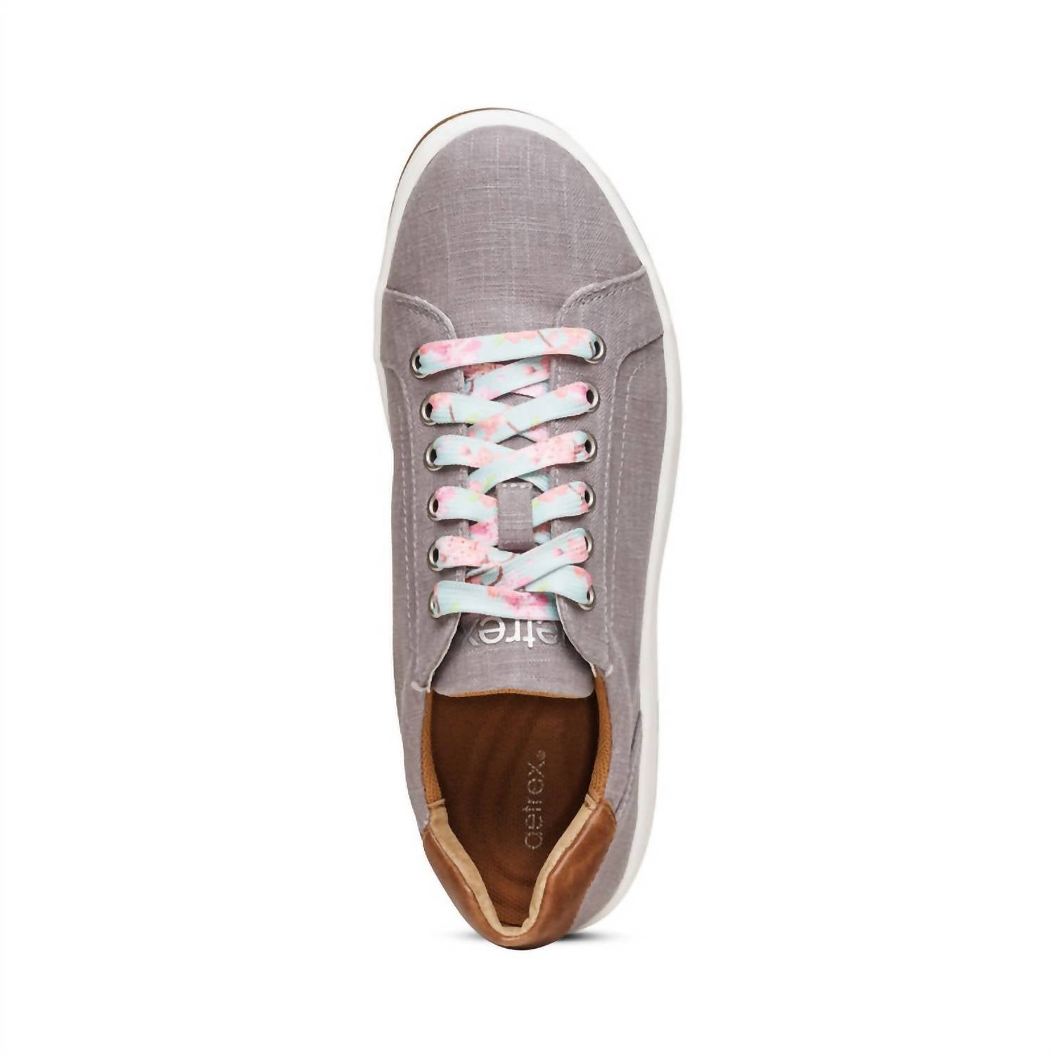 Step into comfort with the Women's Renee Arch Support Sneakers by Aetrex, designed for ultimate support and style. Crafted with a durable canvas upper and lined with moisture-wicking microfiber, these sneakers ensure lasting freshness. They feature the Aetrex Orthotic System for crucial arch support, stabilizing your body and relieving common foot pains like plantar fasciitis. With a lightweight rubber outsole, customizable laces, and a padded collar, each step feels cushioned and supported. Heel Height: 0.75". Color: Grey.
