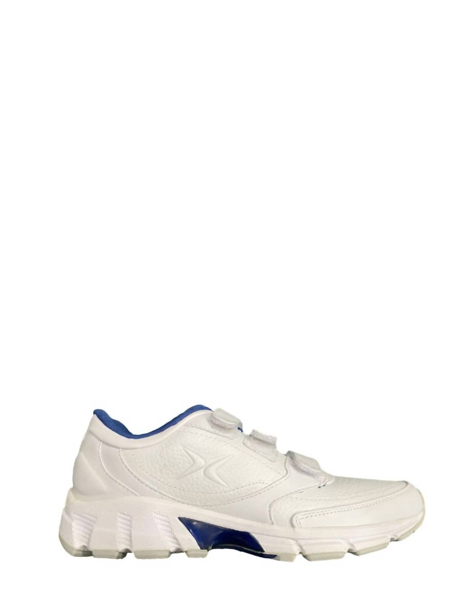 Features a leather or synthetic upper with a subtle, embossed pattern and a logo on the side. Adjustable Velcro straps instead of laces. Thick, durable sole with a distinct tread pattern. Blue accent on the midsole near the arch.