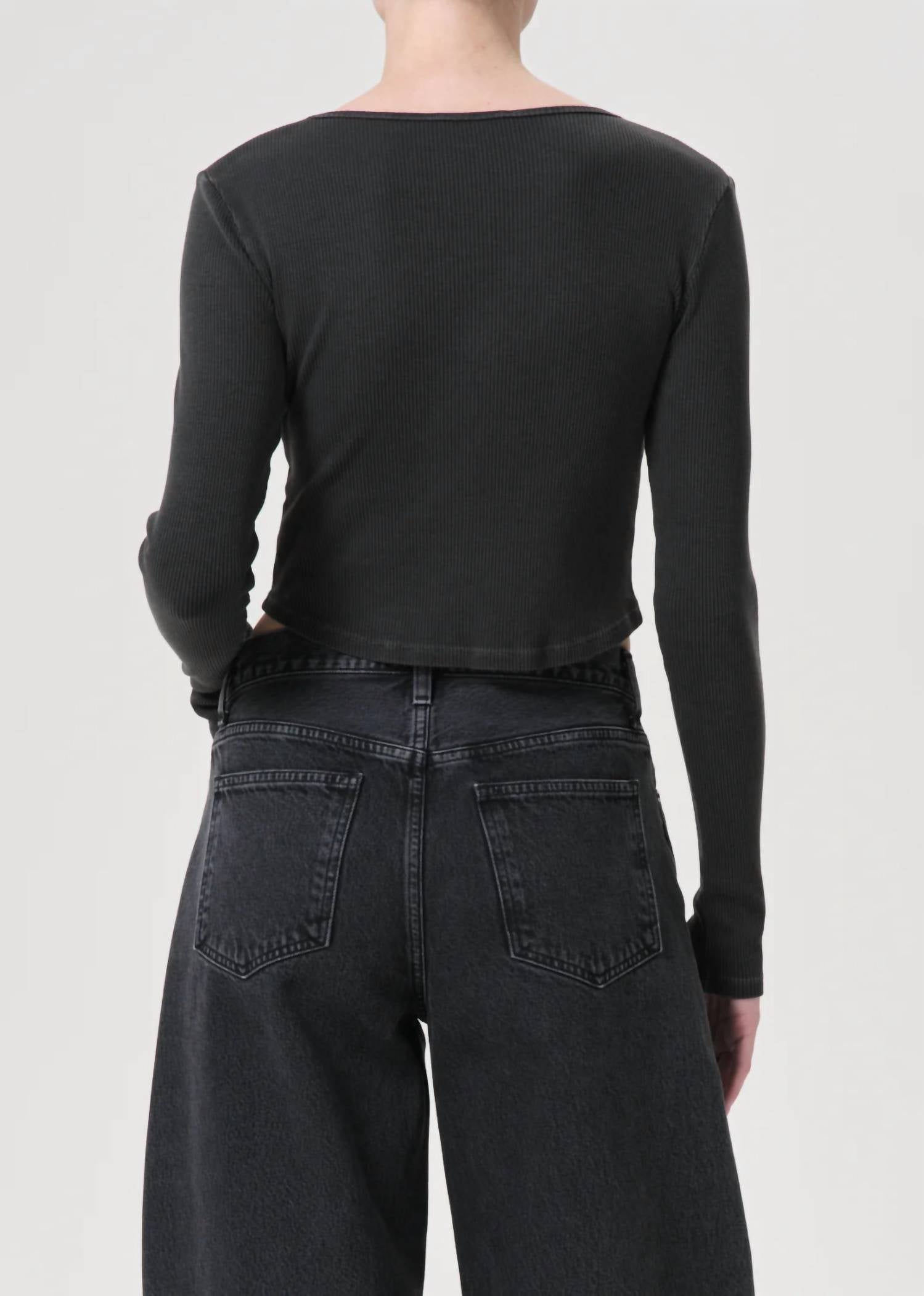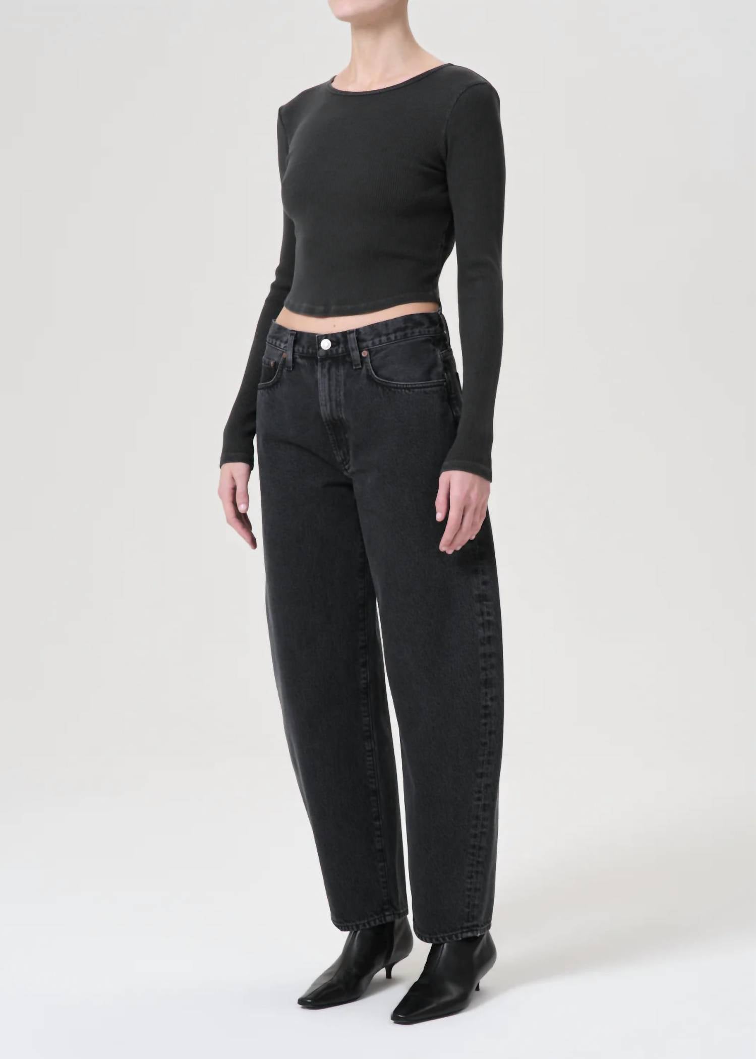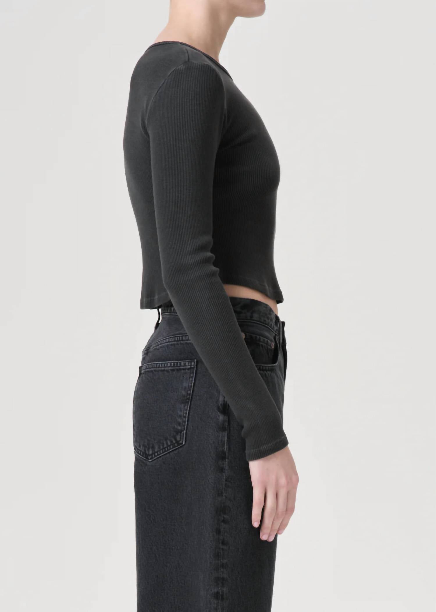The perfect long sleeve tee that goes with just about anything. Introducing the Nova Long Sleeve Tee by AGOLDE, a chic essential for your spring wardrobe in a sophisticated Marker hue. Designed with long sleeves and a crewneck, this tee has a body length of 19.5 inches, offering a sleek and cropped fit. Its composition beautifully combines 49% Organic Cotton, 49% Tencel, and 2% Spandex, ensuring comfort with a lightweight, breathable feel. Made in the USA with imported materials, it features a pull-on closure and is easy to care for with machine wash instructions. Model is 5'10" and wears a size Small.