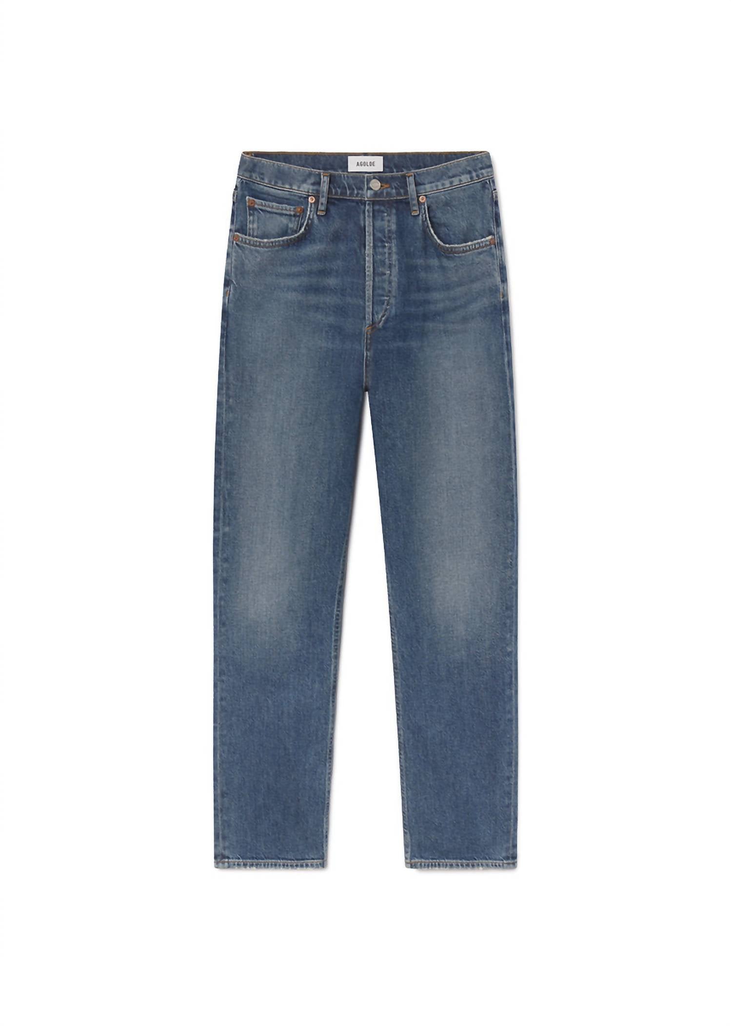 Embrace a nostalgic style with the Pinch High Rise Straight Jeans by AGOLDE, boasting a medium to dark indigo wash called Overcast with subtle fading for a vintage feel. Crafted from lightweight comfort stretch denim, these jeans offer a high-rise and straight-leg silhouette with a 27.5" cropped inseam for an effortlessly flattering fit. Featuring a solid pattern and button closure for easy wear, these jeans combine classic and streetwear trends, perfect for a Thanksgiving dinner party. Care: Machine wash and tumble dry for convenience.