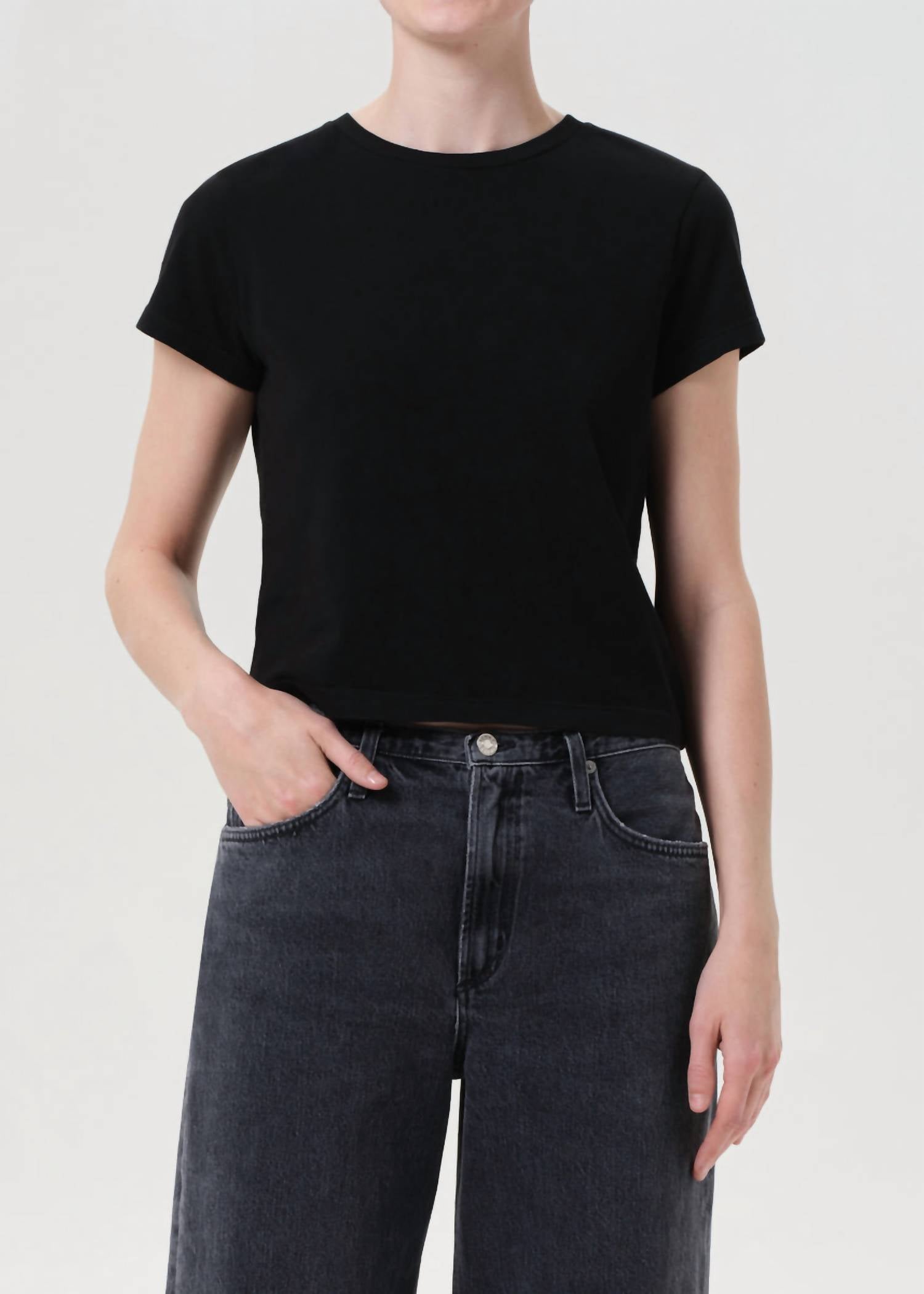 The short sleeve tee you'll want in every color. The AGOLDE Shrunken Tee Top in Windstorm is a minimalist, timeless piece designed for versatility and comfort. Featuring short sleeves and crafted from breathable organic cotton, it offers a soft touch and is perfect for layering or wearing solo. Closure: Pull on, with a classic crewneck design. Care: Machine wash. Ideal for back-to-school fashion.