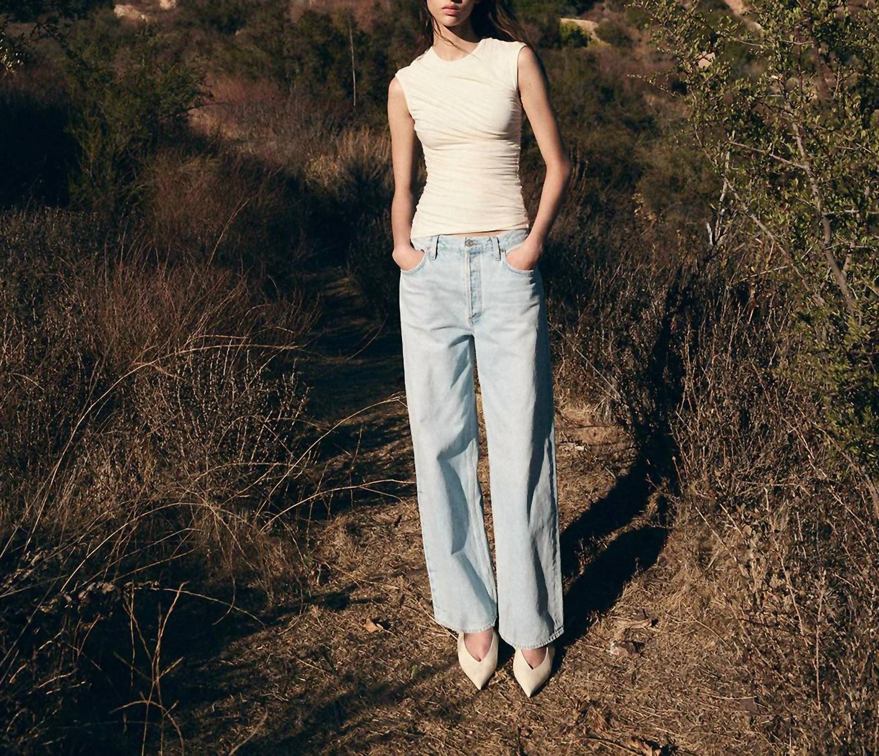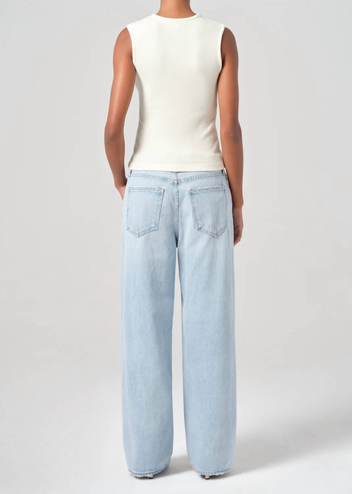 Discover the Women's Low Slung Baggy Jeans by AGOLDE, crafted for those who prioritize both comfort and style. These relaxed-fit jeans feature a wide-leg design and come in a stunning pale indigo, complete with a light wash for a modern look. Made from 100% regenerative cotton, these jeans offer a weightless feel and no stretch, allowing for a soft drape and relaxed demeanor. Designed with a low rise and button fly closure, these jeans have an inseam of 30.5 inches and a leg opening of 21 inches. Care is straightforward with machine wash and tumble dry instructions. Embrace the spirit of summer and streetwear with these versatile jeans, perfect for casual outings and vacations. Model is 5'10" and wearing a size 27. Made in the USA with imported materials.