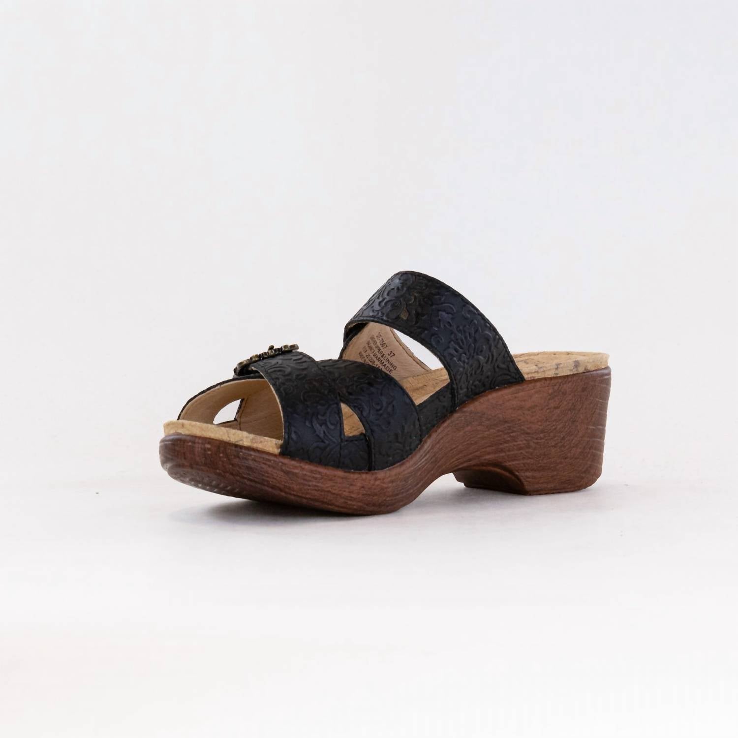 Classicly cute and all-day-wearable. We love this sandal. Step into timeless elegance with the Alegria Sierra Sandal, expertly crafted to offer both style and comfort. This women's sandal features an adjustable crisscross strap with an ornate buckle, set on a slip-resistant, lightweight wood-look wedge with a 2-inch platform heel. The elegant embossed "Go For Baroque" design adorns the genuine leather upper, while the cushioned footbed is lined with soft microsuede for added comfort. Whether you're wearing them from day to night, these medium-width sandals with a round toe shape ensure you stay comfortable without compromising on style.