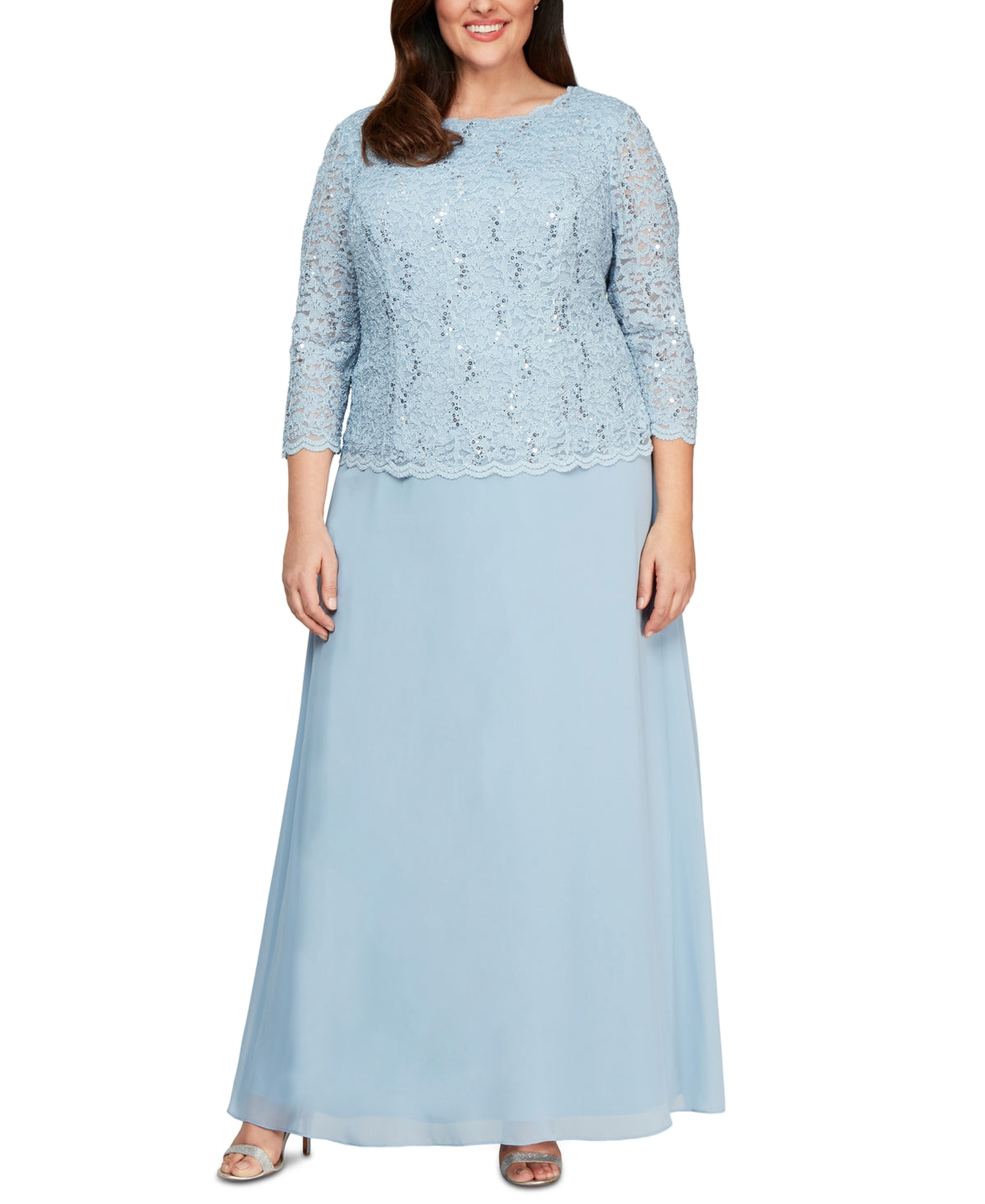 Scalloped lace alight in sequins layers the bodice of this gown that gives the impression of coordinated separates with the ease of a one-piece ensemble| 60 length (size 18W) Hidden back-zip closure V-neck Three-quarter sleeves Full-length A-line skirt Get the perfect fit?book an appointment with one of our alterations experts Lined 55% nylon| 43% polyester| 2% spandex bodice; 100% polyester skirt Dry clean or hand wash| dry flat Imported Special Occasion