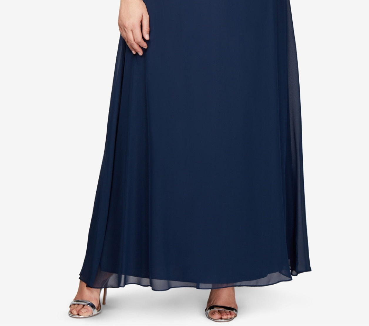 Scalloped lace alight in sequins layers the bodice of this gown that gives the impression of coordinated separates with the ease of a one-piece ensemble| 60 length (size 18W) Hidden back-zip closure V-neck Three-quarter sleeves Full-length A-line skirt Lined 55% nylon| 43% polyester| 2% spandex bodice; 100% polyester skirt Dry clean or hand wash| dry flat Imported Special Occasion