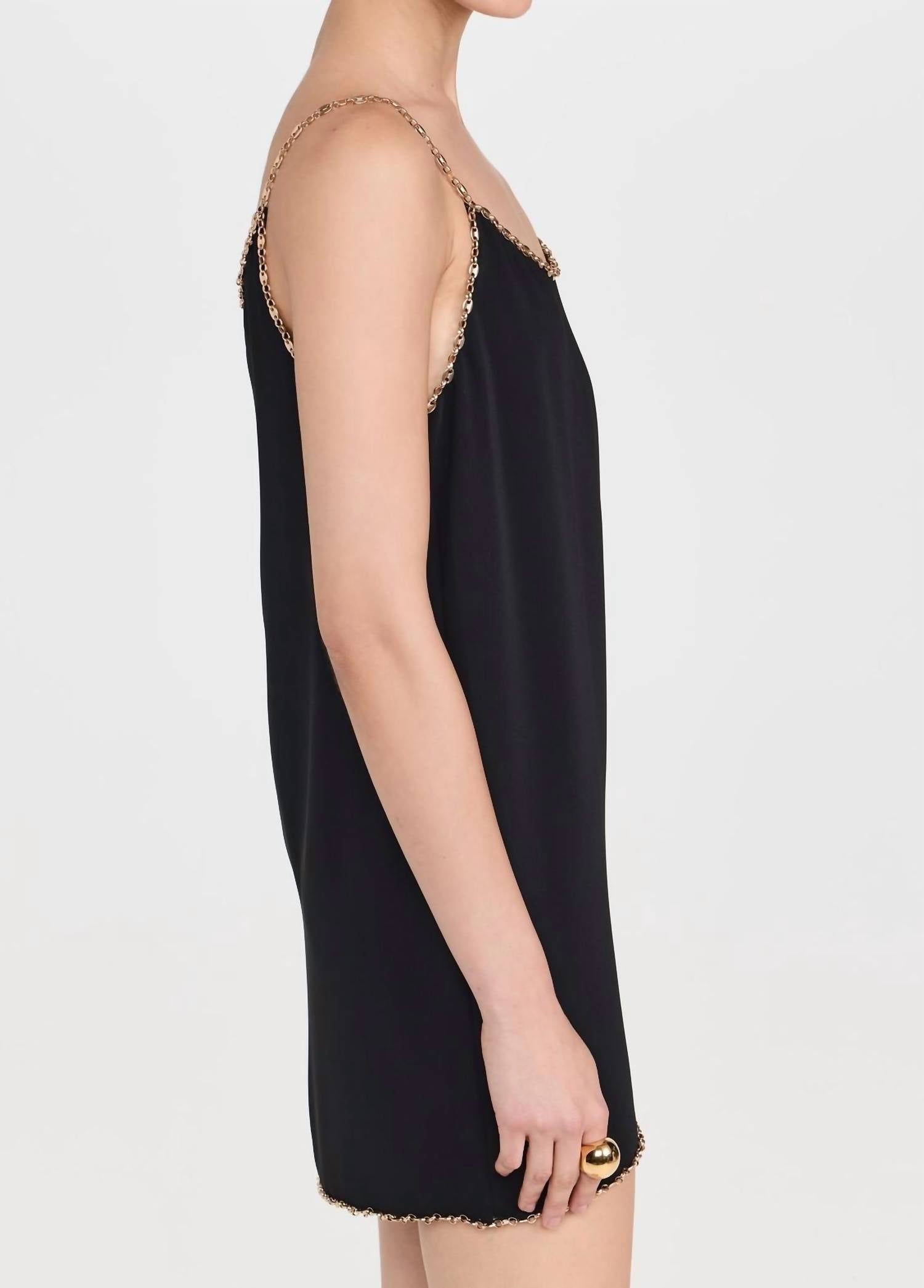 This black slip dress features spaghetti straps and a stylish scoop neck, with a luxurious gold-tone chain trim adding a touch of glamour. Crafted from 100% lightweight polyester crepe, it promises a smooth and flattering fit, enhanced by a bias cut for slight stretch. With a practical pullover design, this imported piece is lined and requires dry cleaning for care. Garment length is 32 inches (size XS).