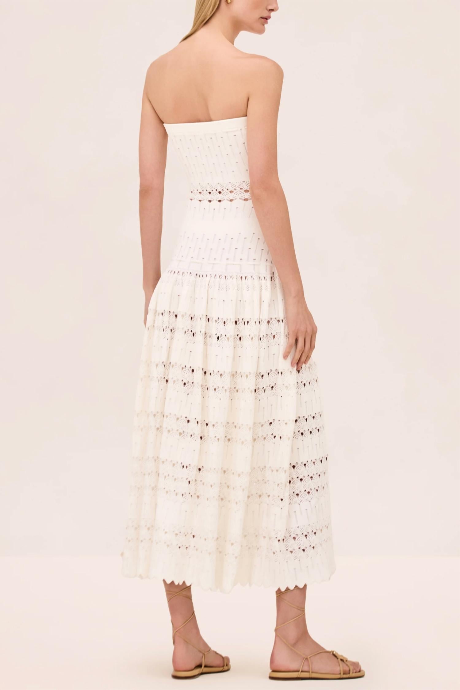 Elevate your summer wardrobe with the Payge Tiered Knit Strapless Dress by ALEXIS, perfect for a beach day or a boho-chic outing. This eye-catching A-line midi dress features a strapless silhouette with an elasticized neckline, offering both style and ease. Crafted from 80% Viscose and 20% Nylon, it boasts tiered knit eyelet detailing throughout, with partially removable lining for convenience. Closure: Pull-on styling. Care: Dry clean only. This imported piece is a versatile addition to your collection, shining in solid white.