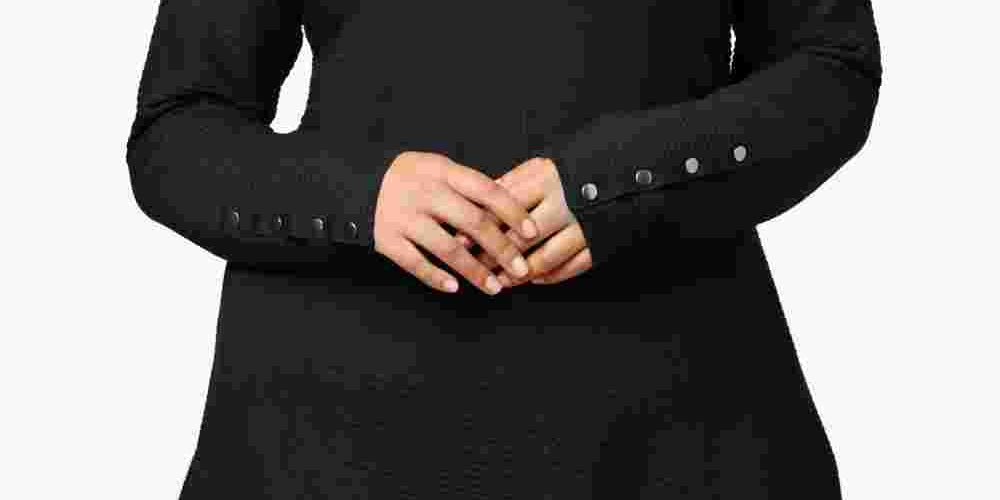 Crew neckline|Ribbed knit; seaat front and back; buttons at cuffs; asymmetrical hem|Easy fit; midweight|Hits at low hip