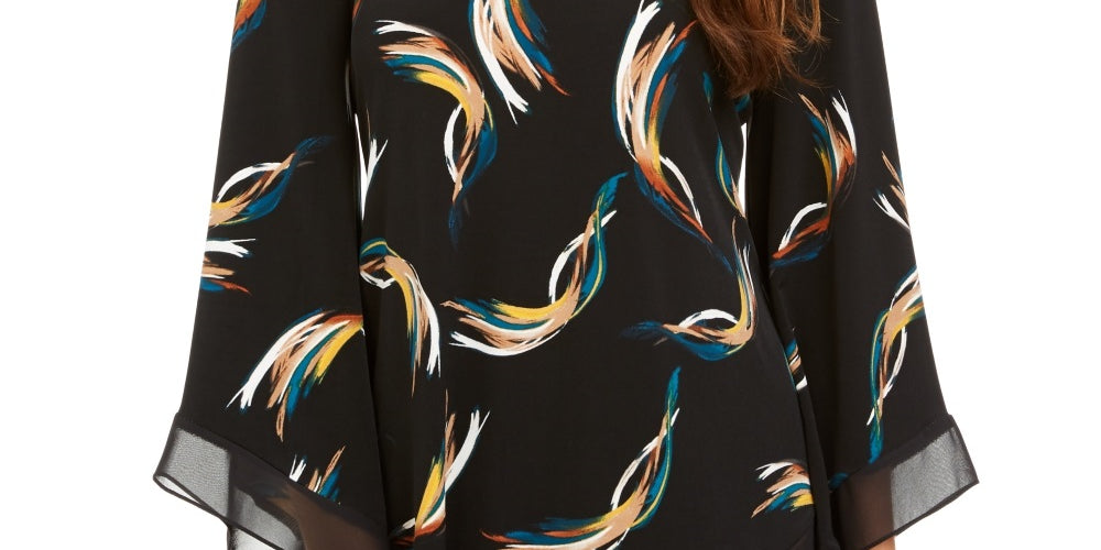 Relaxed fit; approx. 27-3/4" long|Designed to fit and flatter 5'4" and under frame|Scoop neckline|Allover abstract print; pointed hem at front and back|Angel sleeves with semi-sheer trim
