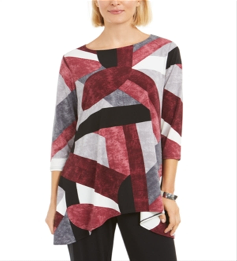 A modern print lends a chic look to this petite swing top from Alfani| styled with 3/4-sleeves for a fresh finish.| Hits below hip| Designed to fit and flatter 5'4 and under frame| Scoop neckline| 3/4-sleeves|
