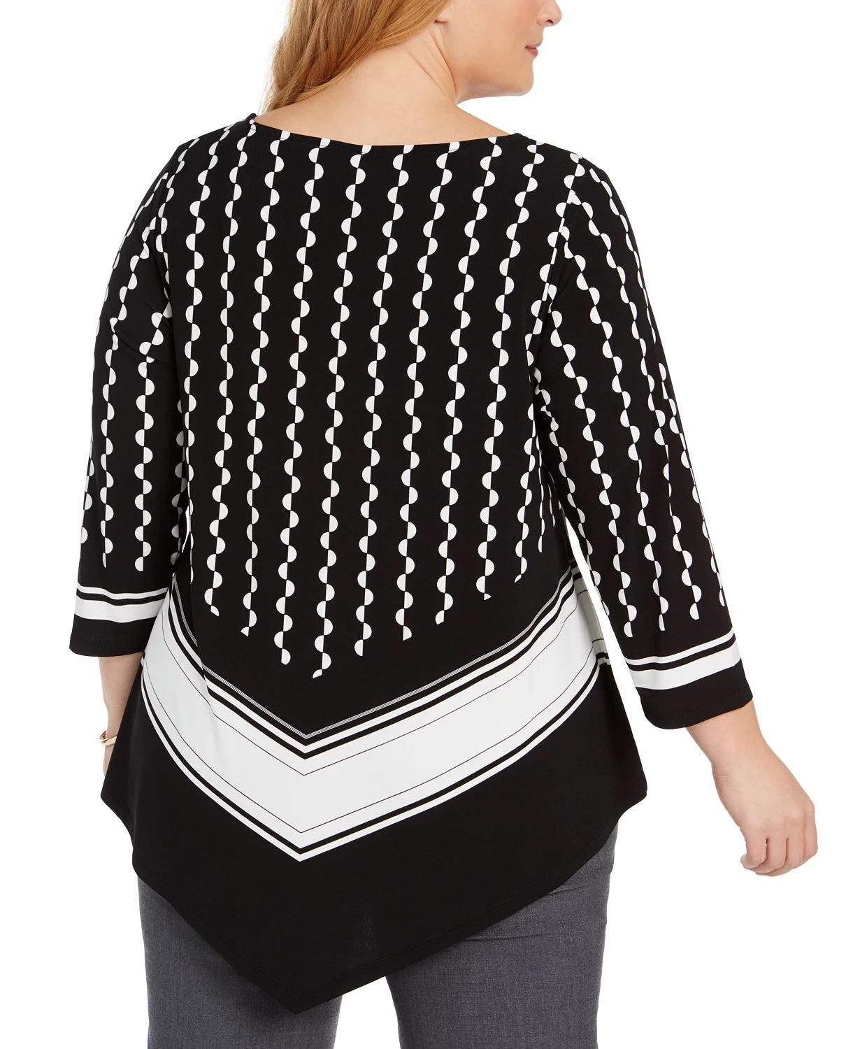 Approx. 33-1/2" long|Scoop neckline|Mixed prints; V-hem|3/4-sleeves|Polyester/spandex
