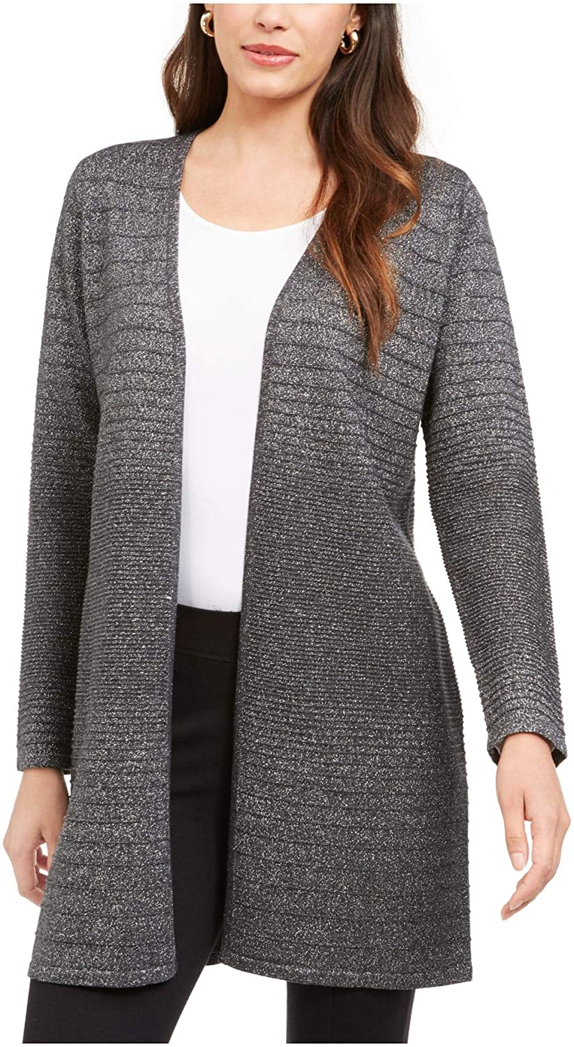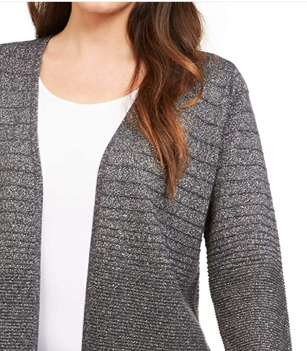 Approx. model measurements: height: 5'10"; bust: 31-1/2"; waist: 24"; hips: 35" and she is wearing a size small. | Approx. 34" long | Open-front | | Viscose/polyester/metallic woven fibers | Machine washable | Imported