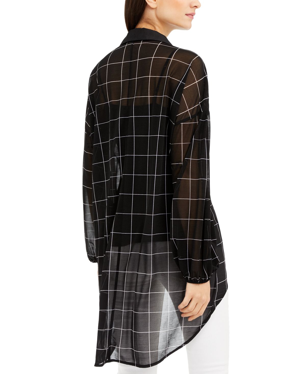 A chic windowpane print works wonders in your wardrobe on this dramatic high-low top from Alfani.| Approx. 26-3/4 long| Notched collar| High-low hem| | Shell; polyester; tank lining; polyester/spandex