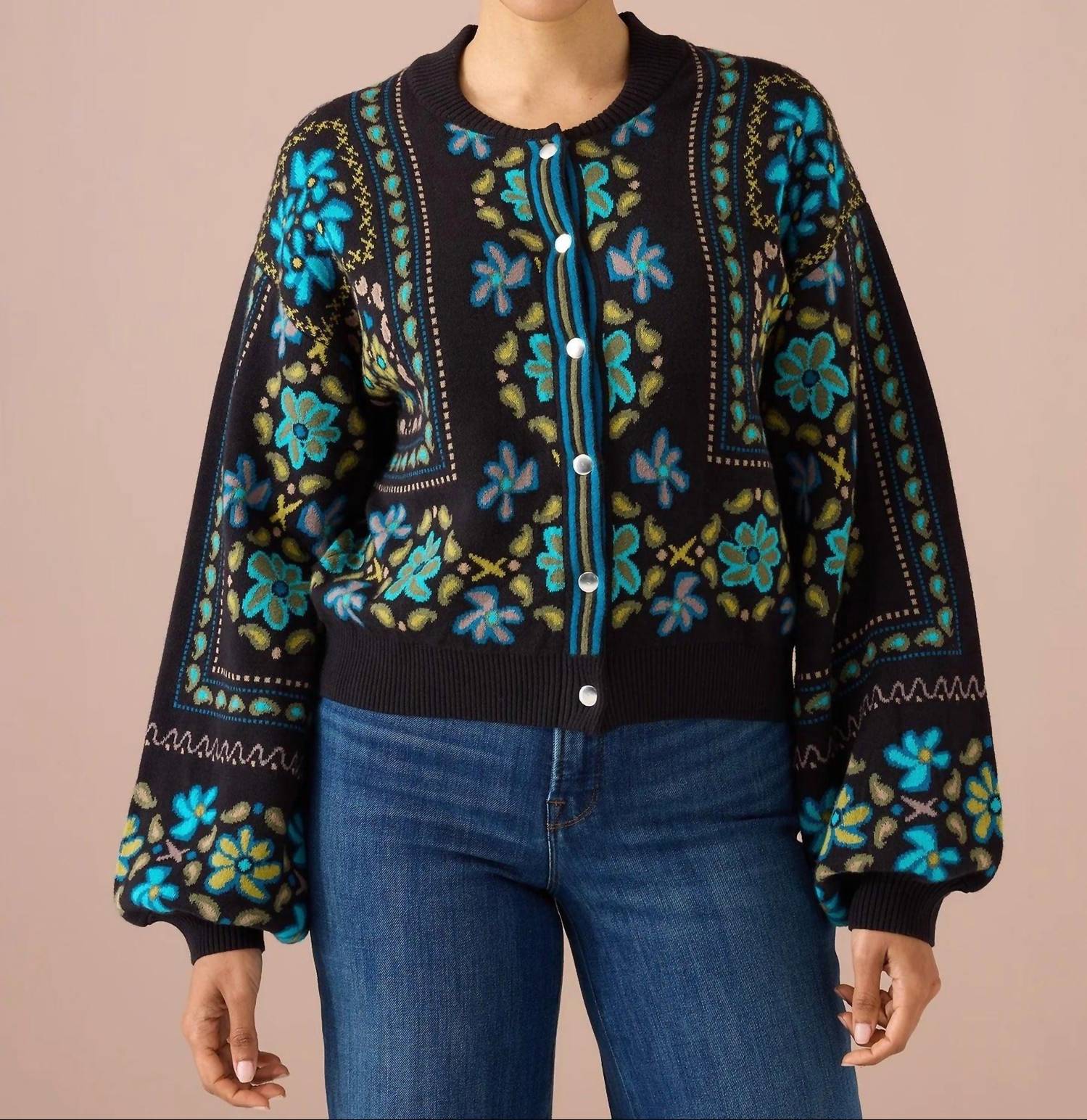 Experience the perfect blend of comfort and style with this trendy crew neck sweater, designed to effortlessly elevate your wardrobe. Pair it with your favorite denim and loafers for the perfect look. Discover the Tanya Sweater Jacket by Alivia, a chic black floral tile piece perfect for crisp fall days. With long sleeves and made from 100% GOTS certified organic cotton, its artisanal jacquard artwork adds a unique touch to any outfit. The metal snap button closure ensures a secure fit, and it measures approximately 21.25 inches in length from shoulder to hem. Crafted with care in India, it requires dry cleaning or a cool, delicate machine wash inside out, followed by line drying.