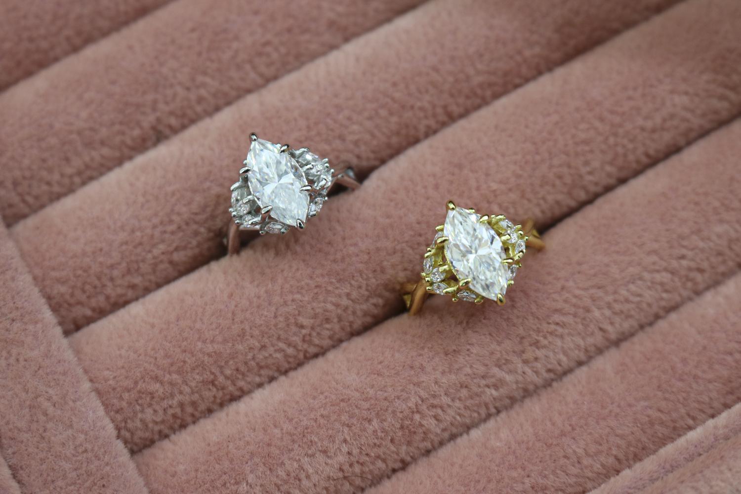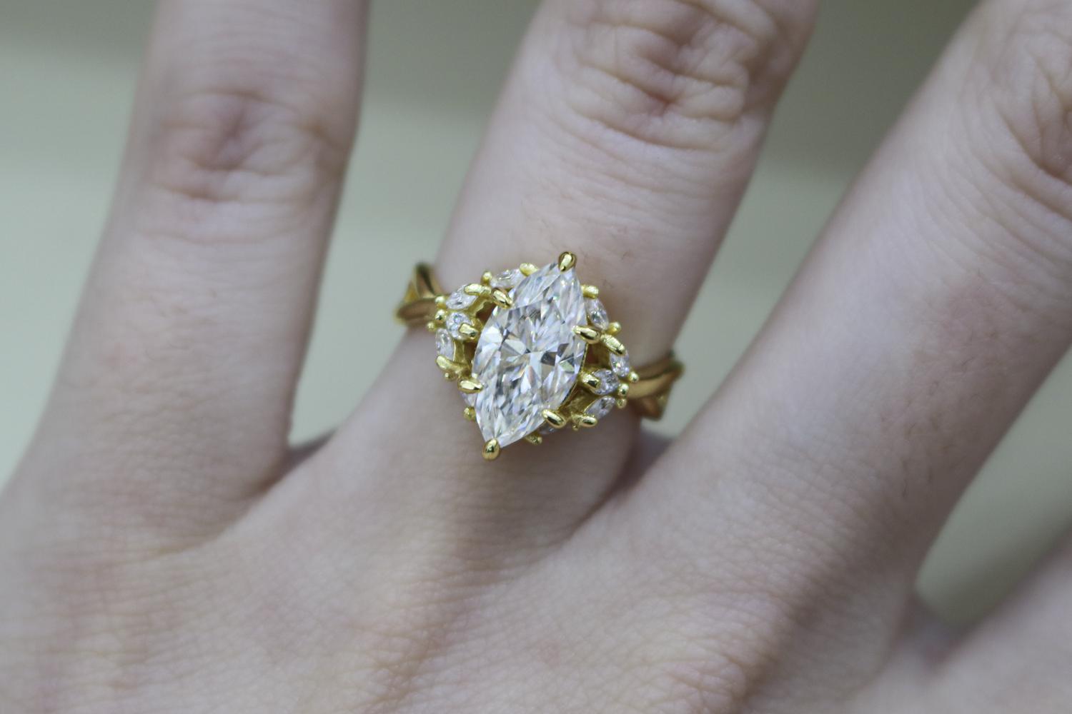 Experience timeless elegance with the Women's Marquise Moissanite Cluster Ring by Allyanna Gifts, a fine jewelry piece that exudes sophistication. Crafted from sterling silver and finished in a luxurious gold color, this ring features a stunning cluster of simulant marquise moissanite stones. With a carat size ranging from 1.51 to 2.00, it offers a bold statement for any occasion. Elevate your jewelry collection with this exquisite fine ring.