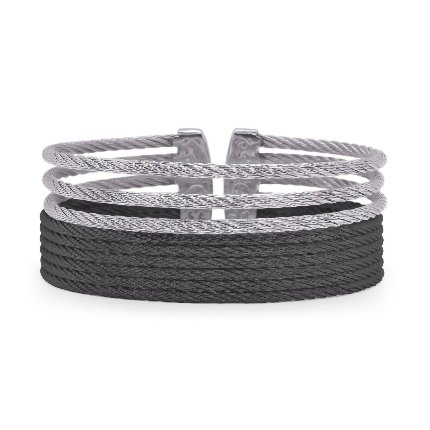 This stand-out bracelet is good enough to wear on its own, or stacked with your favorites. Experience the sleek sophistication of the ALOR Stacked Wide Open Cuff, perfect for any fashion-forward jewelry collection. Crafted from durable stainless steel, this bracelet features a fused band of cables accented with a triple row of open cables. With a striking width of 24mm (0.94 inches), this fashion piece stands out in timeless black and grey tones. Proudly crafted with precision, this imported cuff blends modern design with elegant metals for a truly unique look.