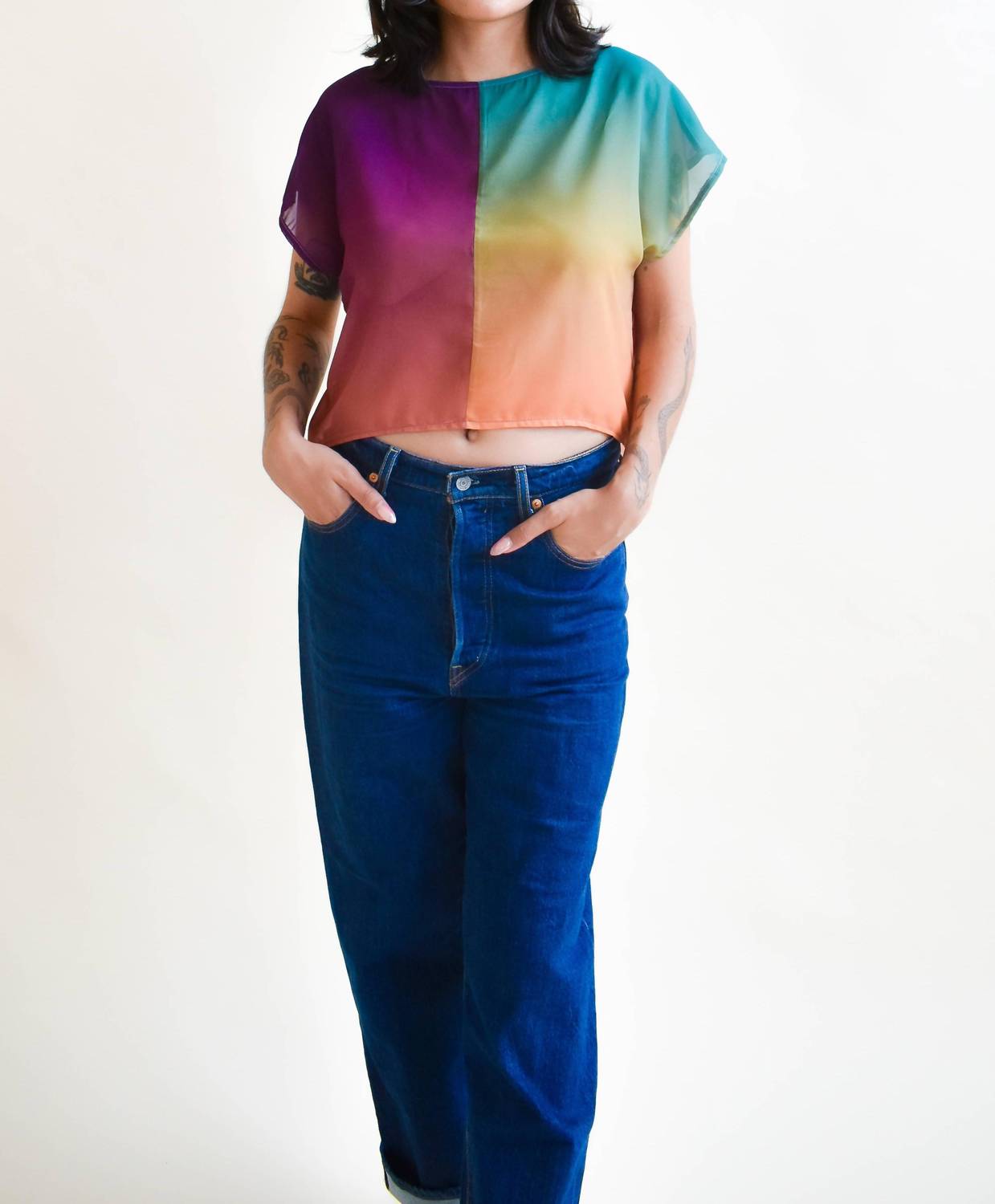 Introducing the Ooak Fox Crop Top by Altar, a stylish nod to 90s fashion with its multicolor pattern and eco-friendly design. Featuring short sleeves and a comfortable pull-on closure, this boxy crop top is crafted from deadstock polyester and showcases a unique patterned design. Handmade in Portland, OR, each piece is a testament to sustainable fashion, utilizing zero-waste techniques and remnant fabrics. Perfect for travel or layering over your favorite high-waisted pieces, this top combines effortless style with ethical production.