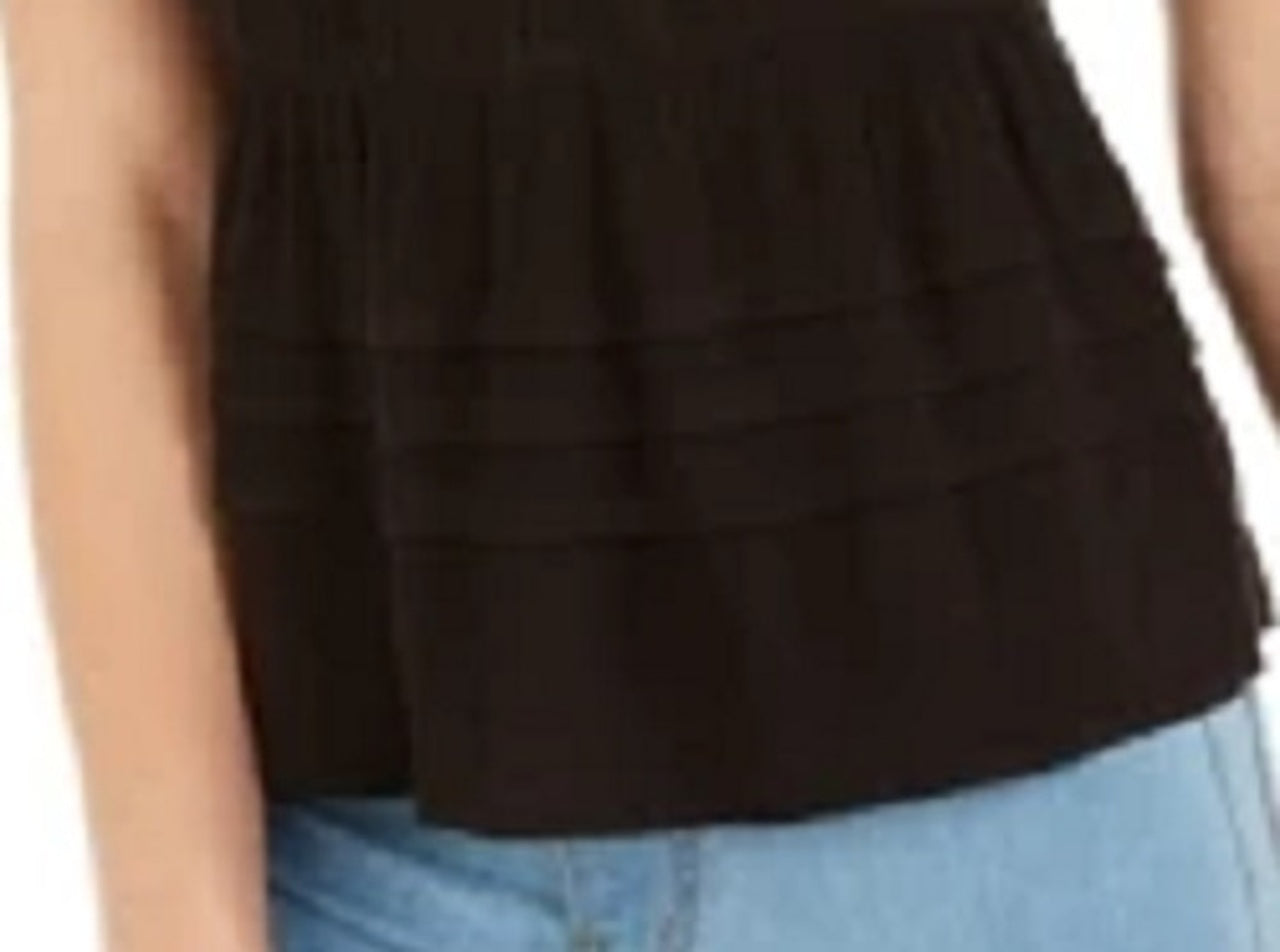 Relaxed fit|Crew neck; back keyhole double-snap closure|Illusion lace trim; pintucked details; self tie at back waist|Short flutter sleeves|Rayon