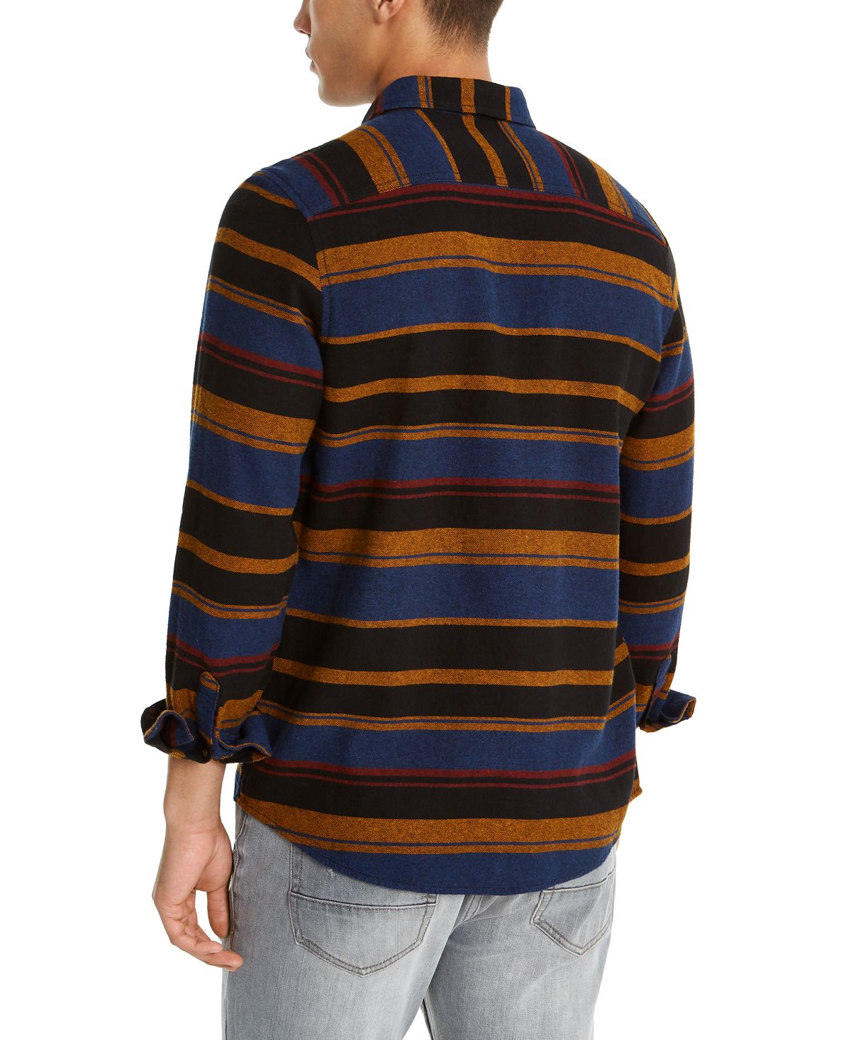 A mix of brisk blue| solar and neutral tones illuminate the variegated stripes of this cotton flannel long sleeve Fay button-up shirt by American Rag| creating a look that is rustic and modern backed by a soft feel.| Regular fit| Point collar| All cotton| Machine washable