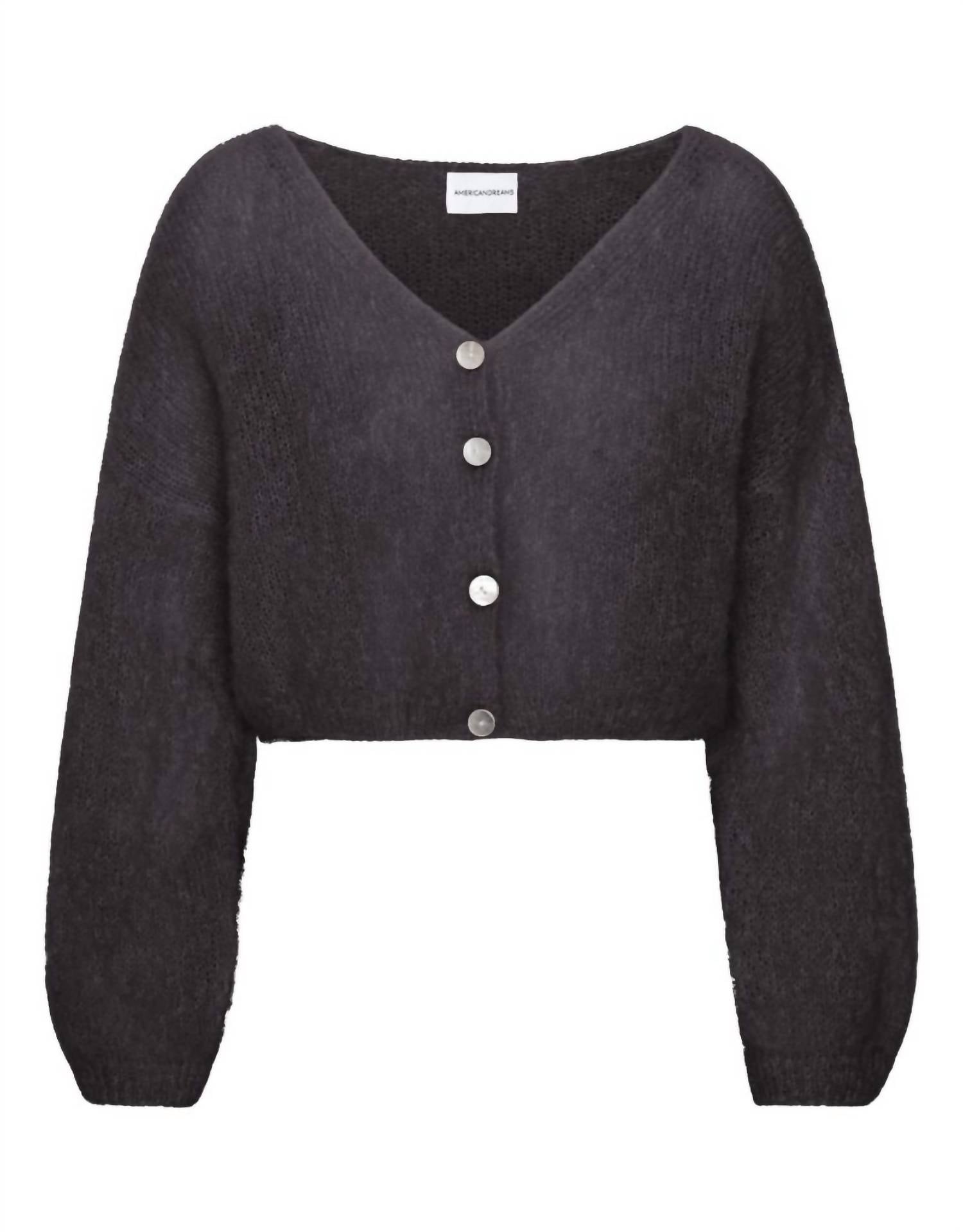 Elevate your wardrobe with the Cornelia Cropped Cardigan by Americandreams, a chic piece in sophisticated medium brown. This long-sleeve cardigan features a textured pattern and a flattering cropped design that highlights the waist, complemented by its voluminous, oversized silhouette. Crafted in Italy from a luxurious blend of 78% mohair, 18% polyamide, and 4% wool, it offers both comfort and style for any vacation or fall occasion. Closure is by button and care is advised with hand washing in cold water and laying flat to dry, preserving its quality.