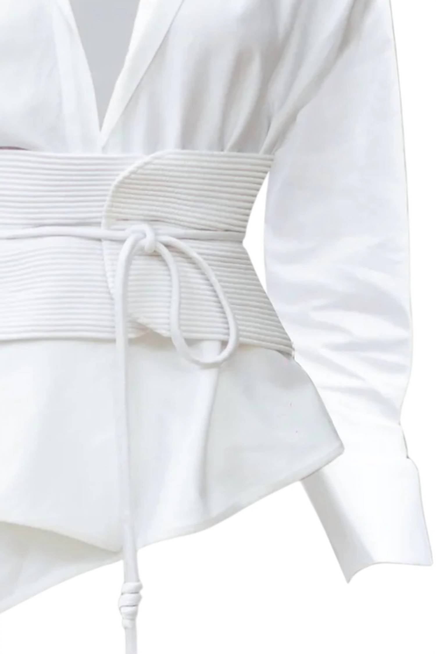 A timeless blouse that will never go out of style. Introducing the Women's Tierra De Luz Shirt With Attached Belt by Andres Otalora, a stunning addition to your summer wardrobe. Crafted from 100% crisp cotton poplin, this blouse offers a sharp silhouette with a plunging V-neckline and a cinched waist for a flattering fit. The shirt showcases long sleeves in a sophisticated off-white hue, perfect for a dinner party or a nod to 90s fashion. With its timeless design and high-quality material, this piece speaks to tasteful elegance and modern sensibility.