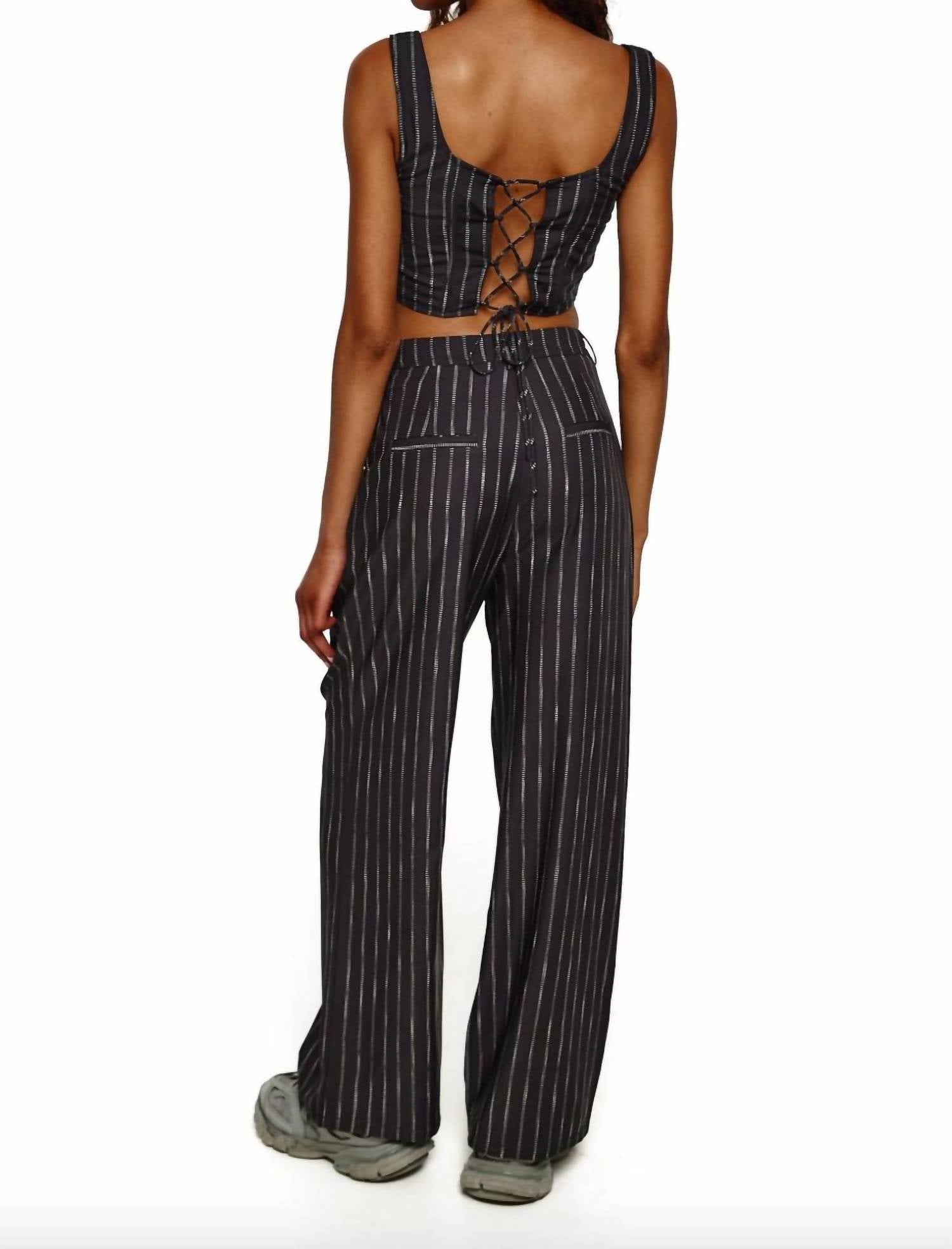 Introducing the Pinstripe Wide Leg Trouser by ANOTHER GIRL, a stylish addition to your wardrobe in a chic navy pinstripe pattern. These high-rise trousers feature a relaxed wide-leg style with a streamlined fit, complete with side pockets for added practicality. Made for summer vacation, the hem hits full length and the side zip offers a seamless look. Care for these trousers by dry cleaning only; they embody maximalist fashion for your elegant summer outings.