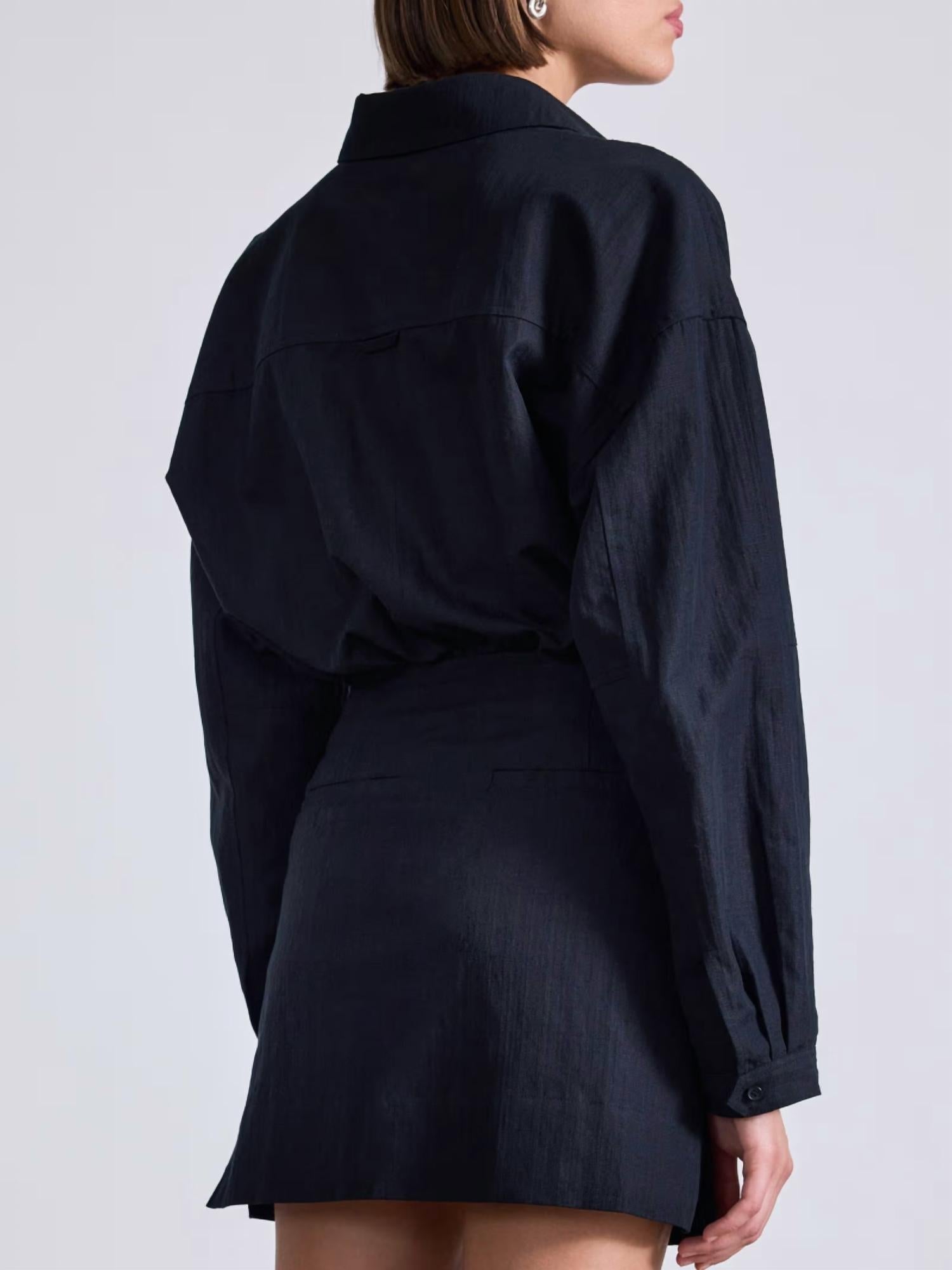Embrace timeless elegance with the La Reina Mini Shirt Dress by APIECE APART in classic black. Showcasing long sleeves, this shirt dress combines a luxurious cotton blend of 57% Cotton, 28% Viscose, and 15% Linen, crafted in China with Italian fabric. It features a stylish crossover flap skirt, complete with a button closure at the left side, and practical back welt pockets. Measuring 34.5 inches in length with a slightly dropped shoulder, this piece is perfect for a chic dinner party or a sophisticated New Year’s Eve gathering. Dry clean only. Model is 5'10" and is wearing a size 6.