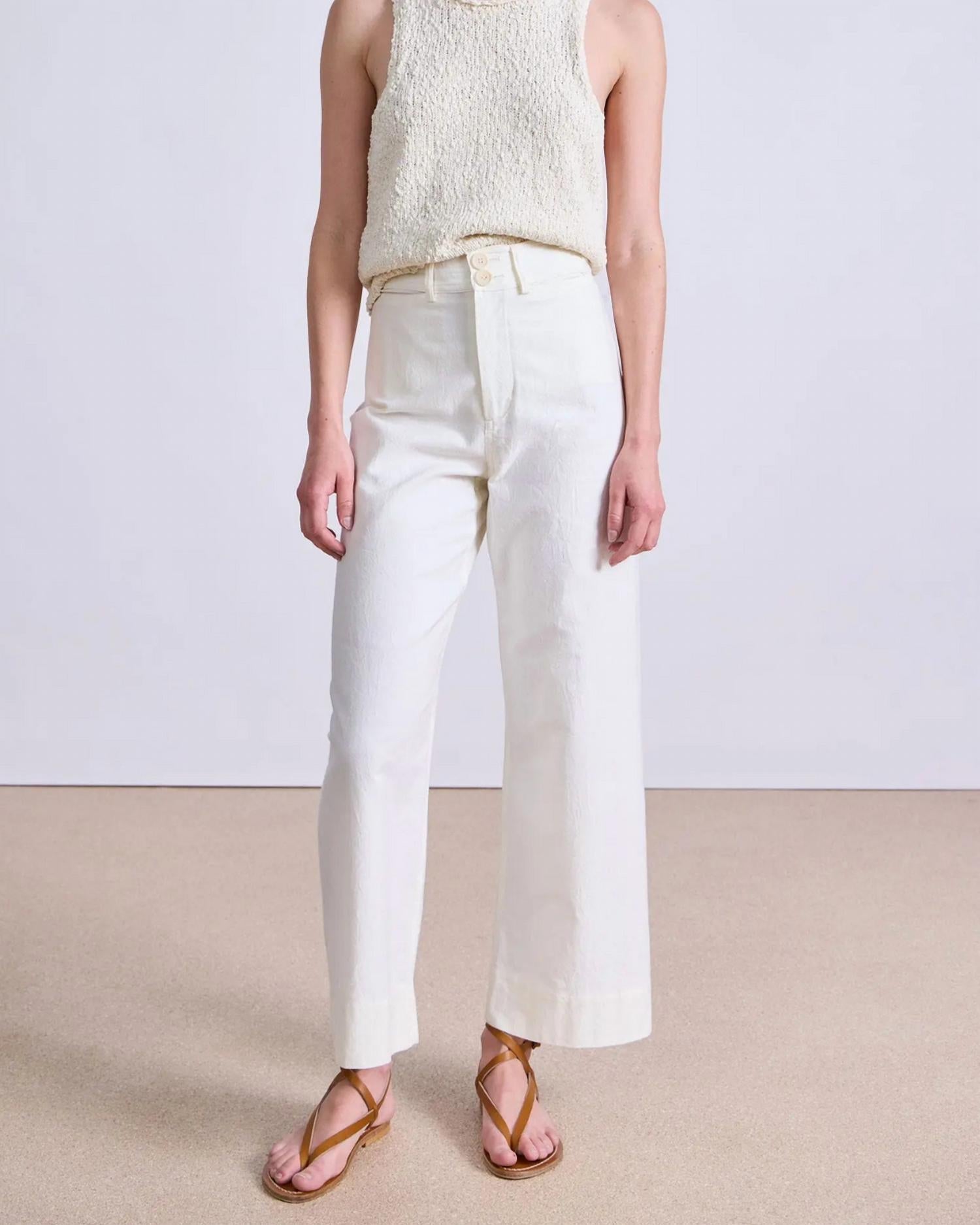 Discover the Merida Pant by APIECE APART, a wide-legged staple in a sophisticated cream hue. These high-waisted pants feature a sleek fit through the hip with a slight crop, enhancing your silhouette with a straight waistband, classic back pockets, and nearly hidden front pockets. Made from 100% Cotton in Turkey, they offer a refined yet comfortable wear with a zipper and signature double-button closure. Care for them with a machine wash cold on a gentle cycle, lay flat to air dry, and low iron for best results.