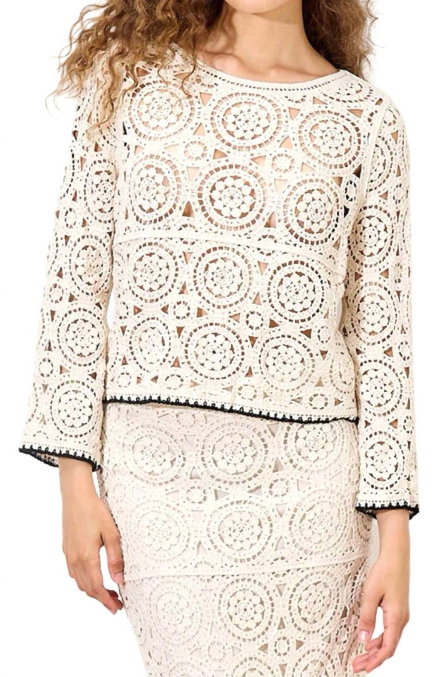 Elevate your weekend wardrobe with the Crochet Bell Sleeve Top by APRICOT, an essential piece in a sophisticated stone shade. This women's top is crafted from comfortable cotton, featuring a scoop neckline and long sleeves adorned with crochet and contrast blanket stitch detailing at the hem and cuffs. With a pull-on closure, it's designed for effortless elegance. Perfect to pair with a tiered maxi skirt for a chic, boho-inspired look.