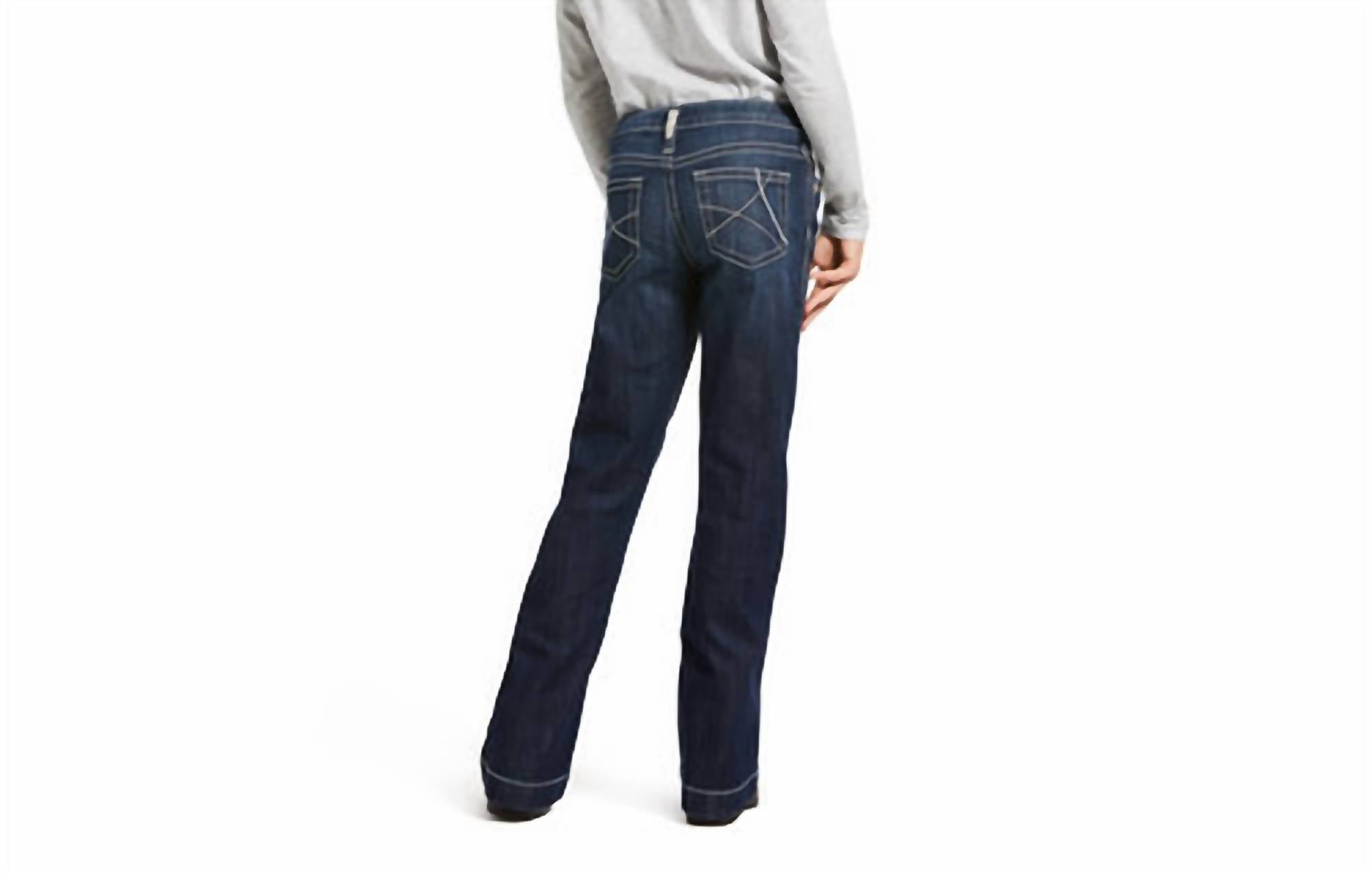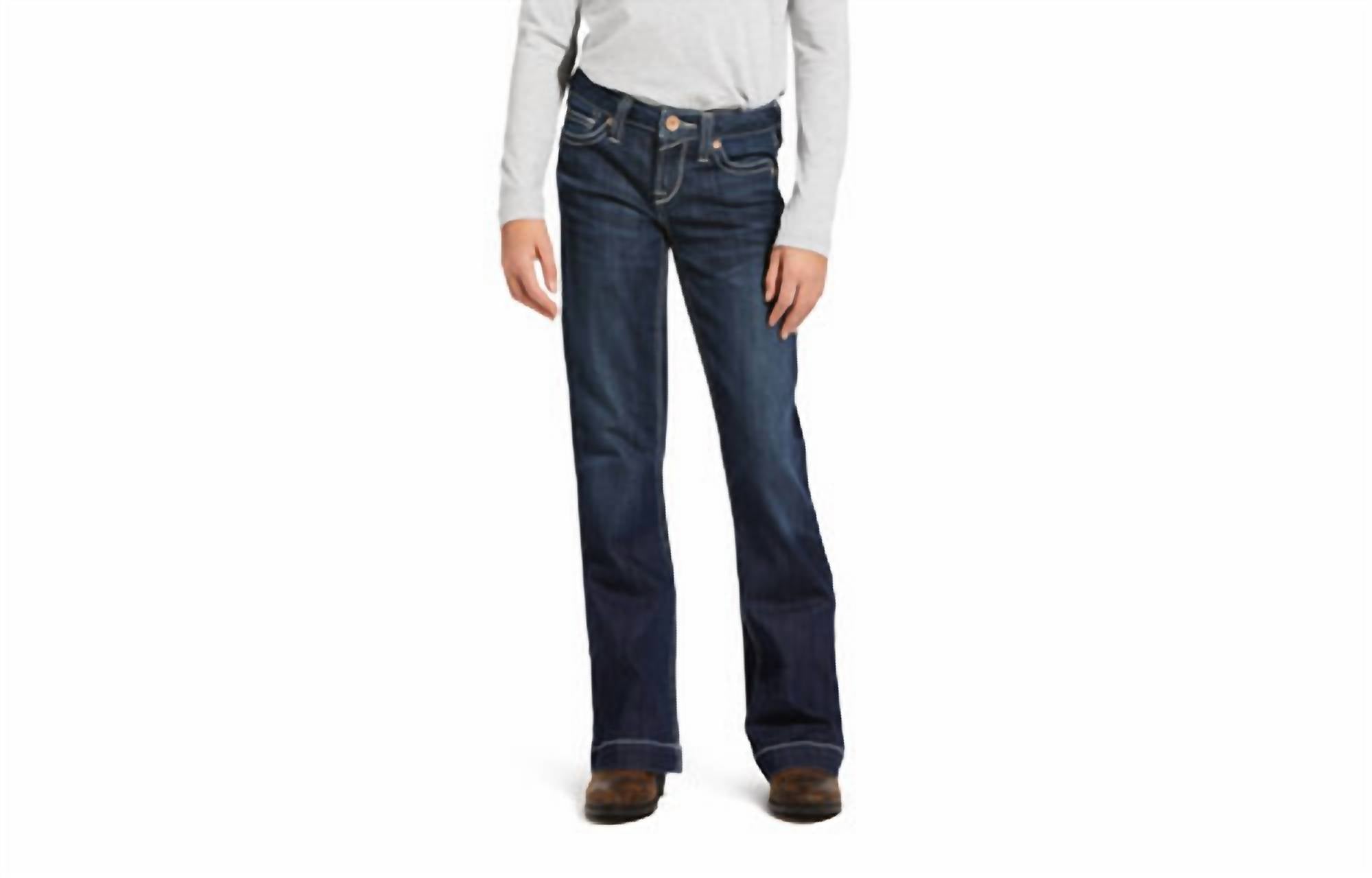 Introducing the ARIAT Girl's Trouser Mid Rise Stretch Ella Wide Leg Jean in Naomi. These jeans are crafted from a 9.75 oz ring-spun stretch denim blend consisting of 93% Cotton, 5% Polyester, and 2% Spandex, offering a comfortable fit with a modern wide-leg silhouette. Featuring hand sanding, whiskers, and five-pocket styling, they are slim fitting through the thigh and gradually open from mid-thigh to an 18" boot cut leg opening. These imported jeans are designed for travel, for school time, for horse time, or for just plain hang time; this jean goes wherever she goes.