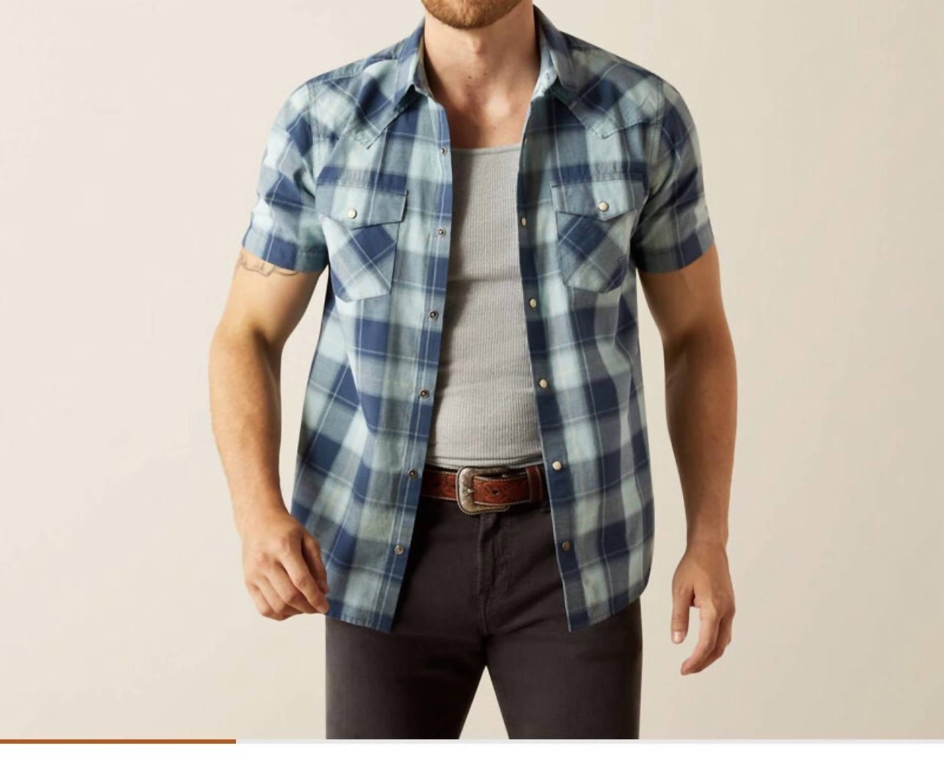 This slim-fit long-sleeve shirt is constructed from 100% cotton and features a button-front closure with button-down collar points. The design includes adjustable cuffs with an extended detail for rolling, a left chest pocket with a hidden pen slot, and Ariat branding. The shirt is cut with extra length for tucking.