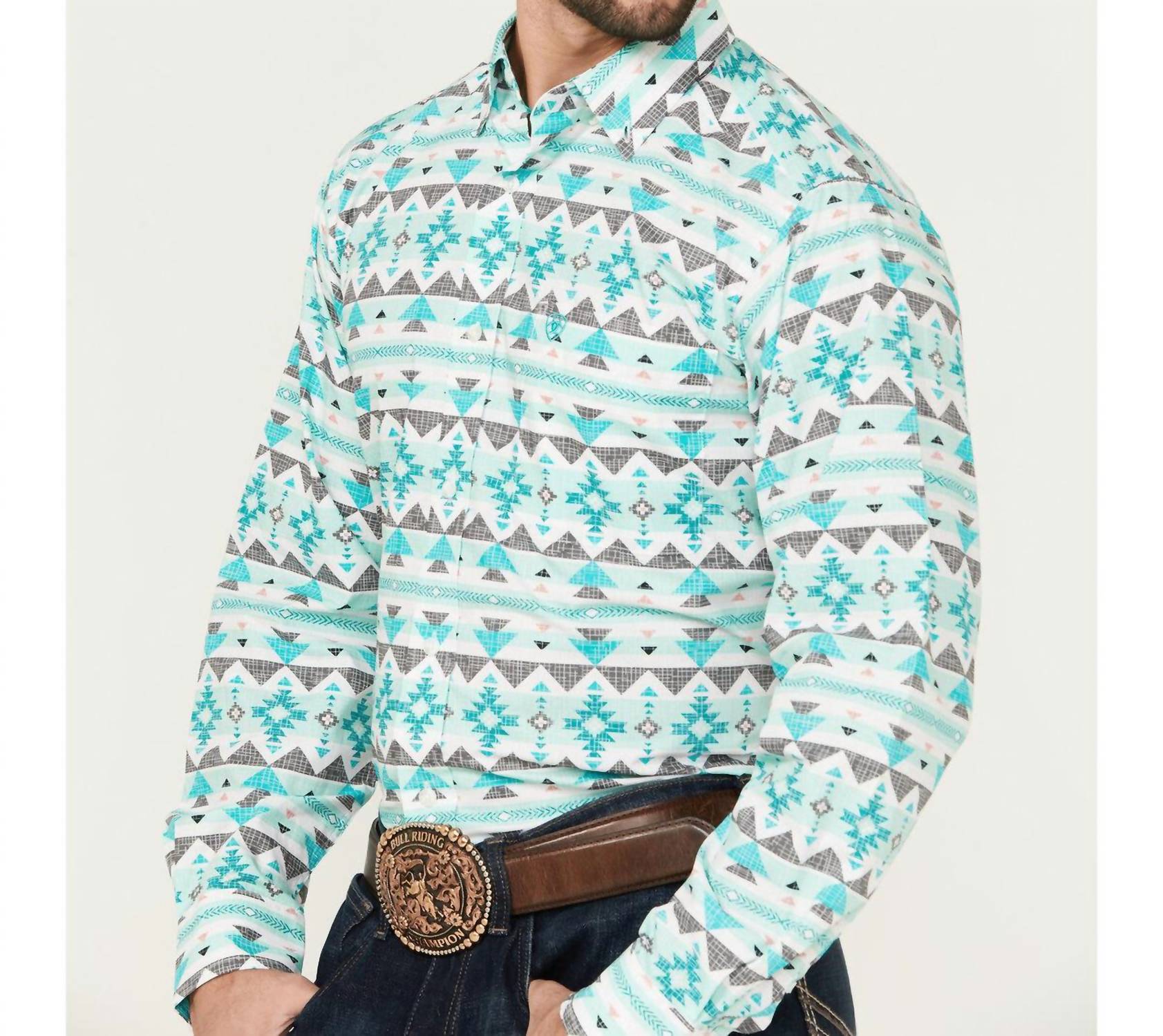 Introducing the ARIAT Jacey Fitted Shirt, a stylish addition to any wardrobe with its geometric pattern and spread collar, perfect for a western-inspired look. Made from 100% cotton, this long-sleeve shirt features a button-down placket and cuffs, providing both comfort and a touch of sophistication. A single patch pocket on the left chest with logo embroidery adds a subtle yet distinctive detail. Care: Machine wash.