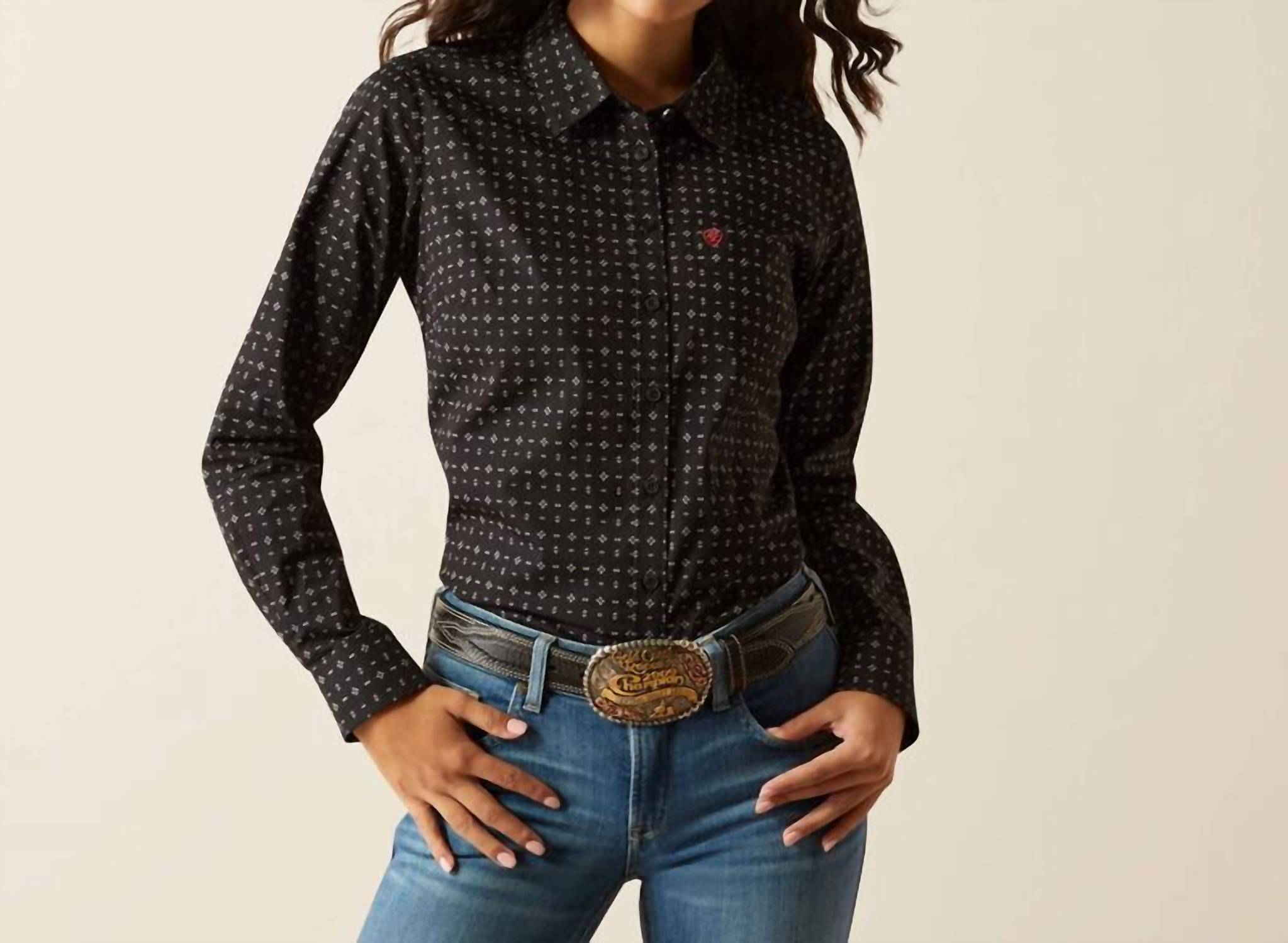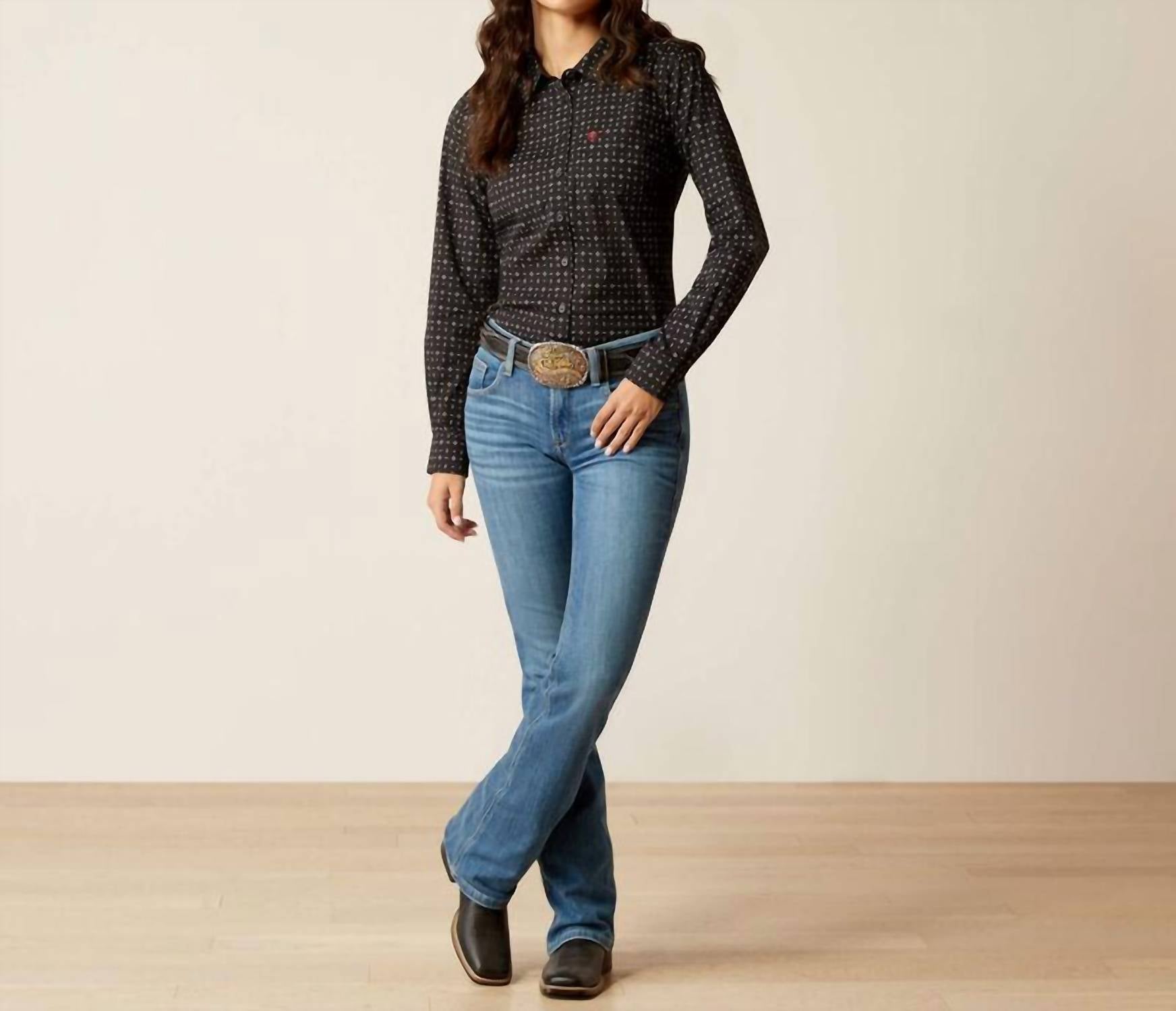 Perfectly tailored and soft to the touch. The Kirby Stretch Long Sleeve Shirt by ARIAT is the perfect blend of style and comfort with its Gia Geo Print, ideal for making a statement. Crafted from a 97% Cotton Poplin and 3% Spandex blend, this women's button-down features a spread collar, long sleeves, and a single patch pocket with logo embroidery. The shirt offers a sleek geometric pattern with a button-down placket and cuffs, round hem, and a straight yoke on the back. Easy to care for, it is machine washable for your convenience.