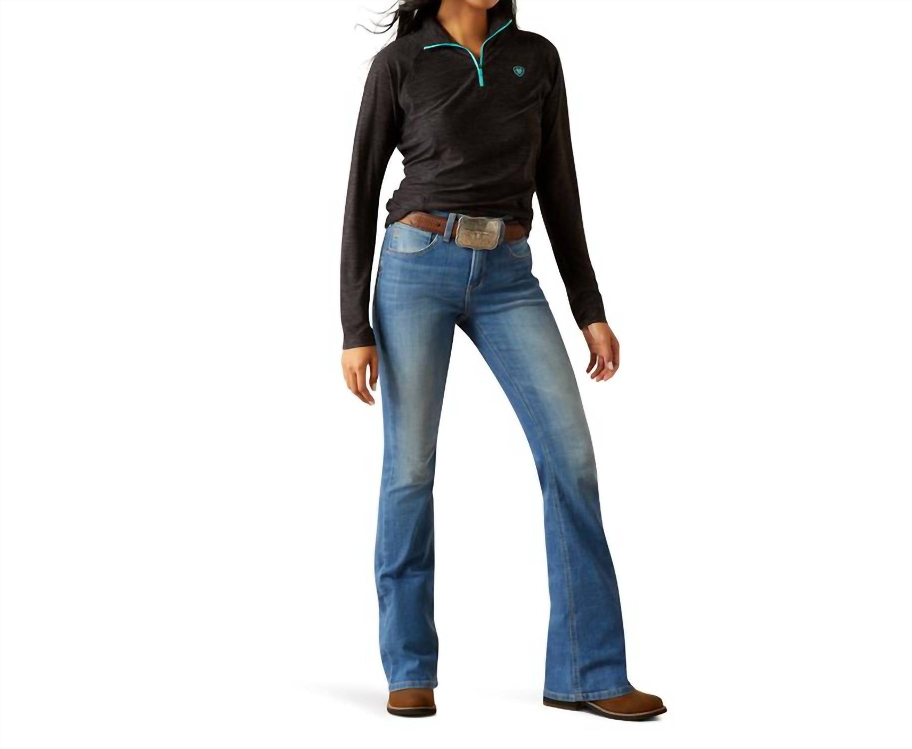 Whether you're running around town or lounging at home, this sweatshirt works for both. Introducing the Laguna 1/4 Zip Top by ARIAT, perfect for those cooler fall days in chic black. This women's sweatshirt showcases a distinctive turquoise zipper and Ariat® arm logo accents, crafted from 100% polyester for ultimate comfort and moisture management. Designed with long sleeves, it features proprietary Moisture Movement Technology™ and FreshTEK™ for sustainable odor resistance. Closure: Zip closure. Care: Machine wash. Ideal for layering or wearing solo, this piece highlights the brand's commitment to both style and functionality.