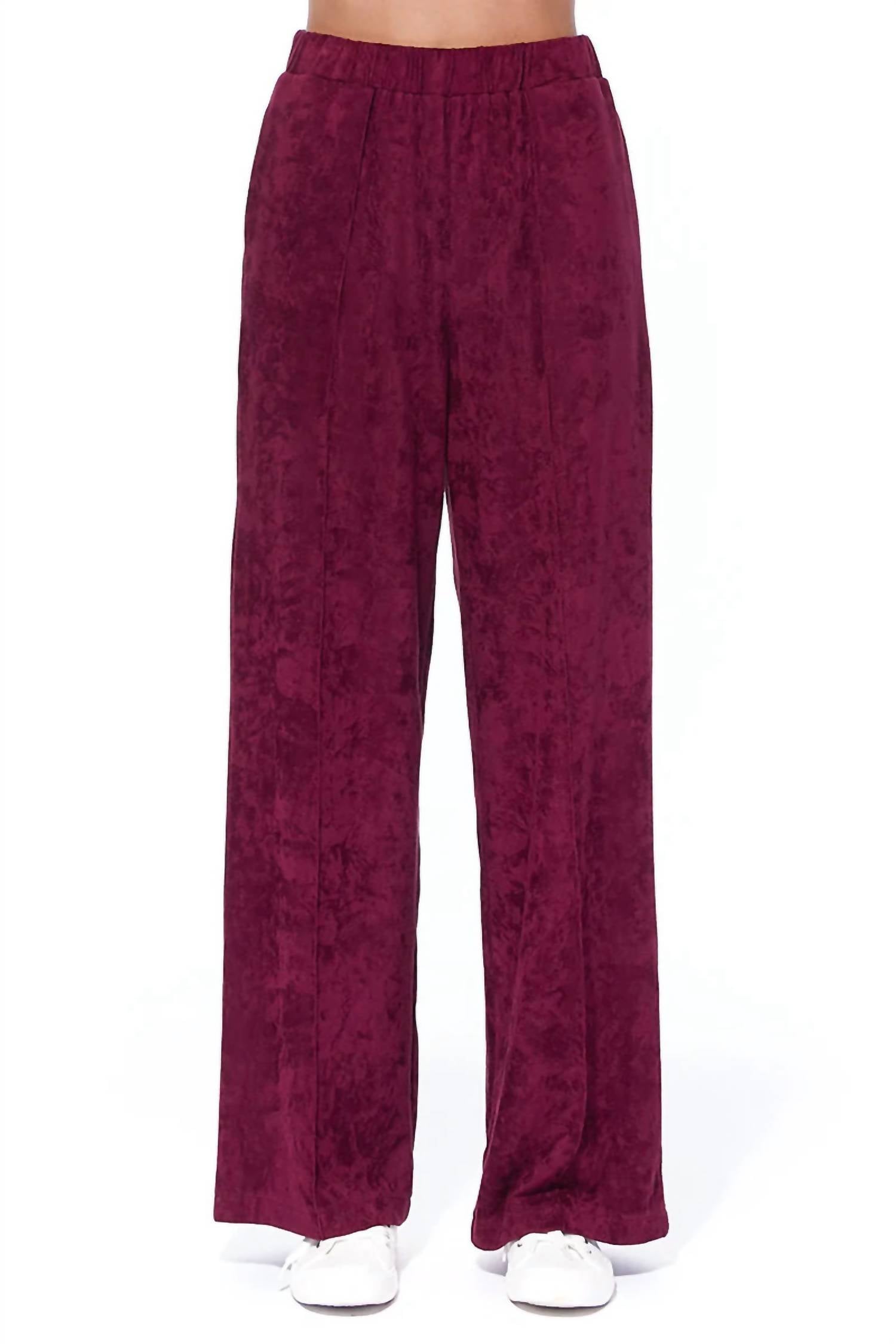 Introducing the Just Like That Suede Pant by Aryeh in a chic wine hue, bringing both comfort and style to your wardrobe. These wide-leg pants feature a flattering ankle-length design with an elastic, pull-on waist for ease of wear. Crafted from soft suede, they offer both elegance and functionality with convenient hip pockets. Perfect for any spring dinner party, this versatile piece is a must-have for the minimalist, fashion-forward woman.