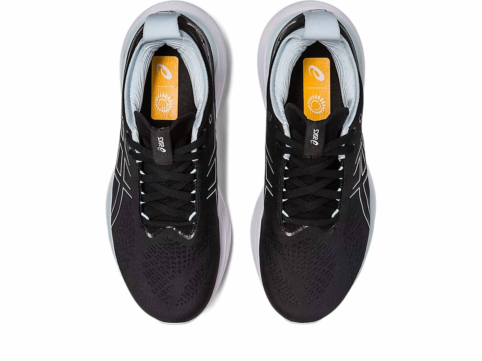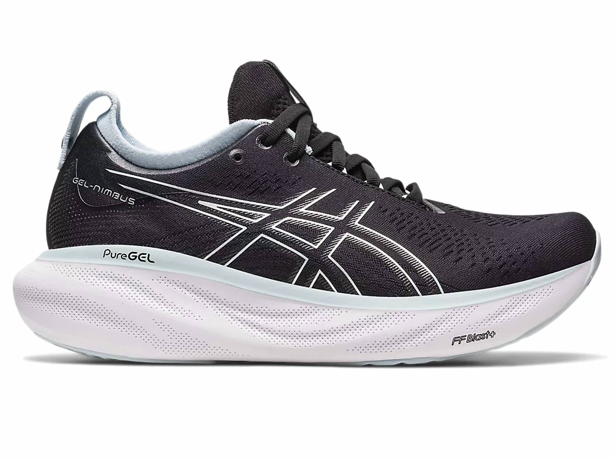 Introducing the ASICS Women's Gel-nimbus 25 Running Shoes in Black/Reborn Blue, designed for superior performance and style. Featuring an engineered knit upper, these shoes wrap your feet with a soft feel while enhancing breathability. Emphasizing sustainability, the main upper material consists of at least 75% recycled content, reducing waste and carbon emissions. The PureGEL™ and FF BLAST™ ECO PLUS technologies provide outstanding cushioning for softer landings and responsive toe-offs, while the OrthoLite™ X-55 sockliner enhances step-in comfort. Reflective details improve visibility in low-light conditions, accompanied by an AHAR™ outsole rubber for improved durability, making them ideal for fitness and workout sessions.