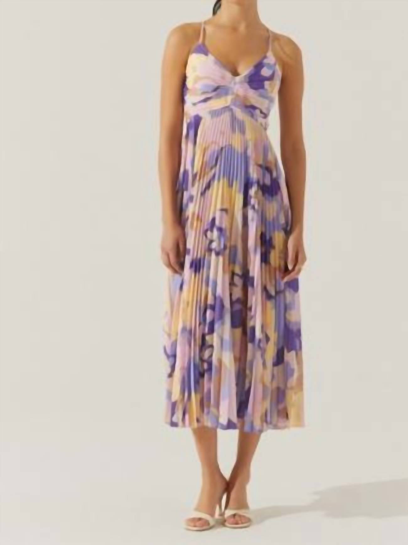 The perfect length dress does exist. Meet the Blythe Floral Plisse Midi Dress by ASTR, a stunning choice with its plunging V-neckline in a captivating purple multi floral print. This sleeveless A-line dress features a strappy cutout back with tie strap details and adjustable straps for a personalized fit. Crafted from 100% polyester, it offers a concealed zip closure and is partially lined for comfort. For best results, dry clean only. Model wears a size S (5'9 1/2" height) with a length of 50 3/4", bust at 33 1/4", and waist 29".