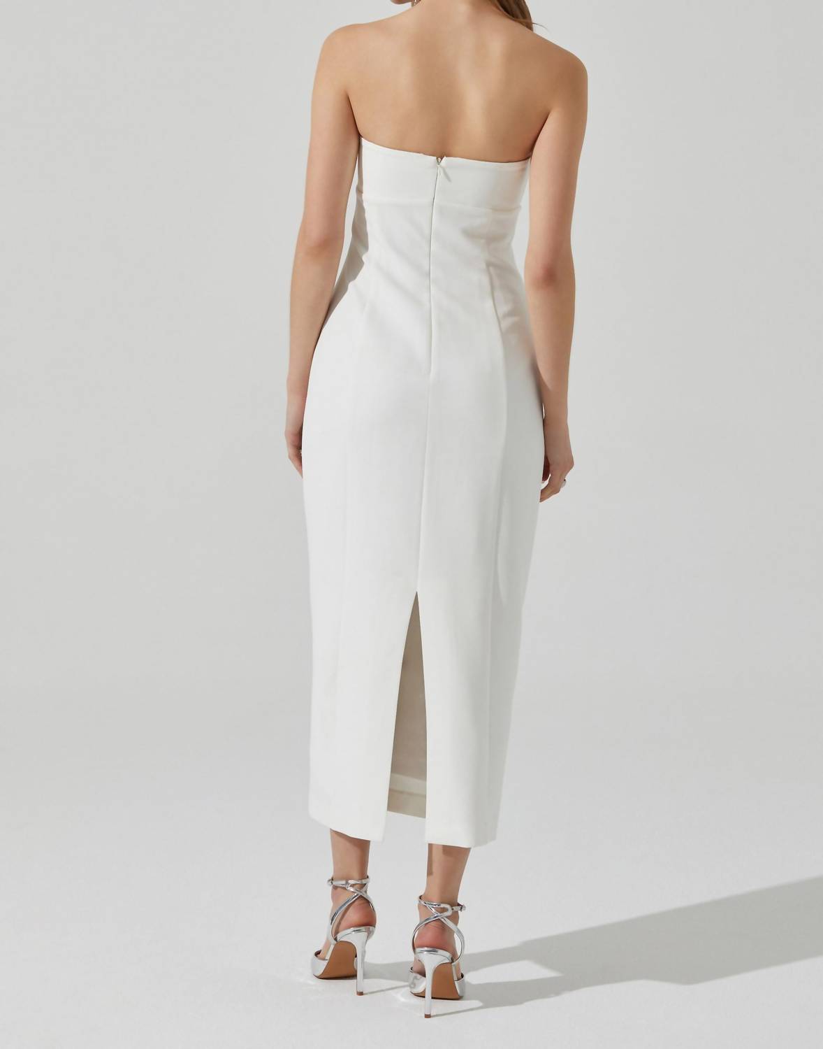 A midi dress so versatile, your options for wearing it are endless. Elevate your wardrobe with the Camryn Embellished Midi Dress by ASTR, a stunning choice for any elegant occasion. This strapless, off-the-shoulder white dress boasts a figure-flattering bodycon silhouette with boning at the bust and grip tape for added support. Crafted from 95% Polyester and 5% Elastane with a 100% Polyester lining, it features a concealed back zipper with hook and eye closure and a 14" center back slit for ease of movement. To maintain its intricate embellishments, please dry clean only.