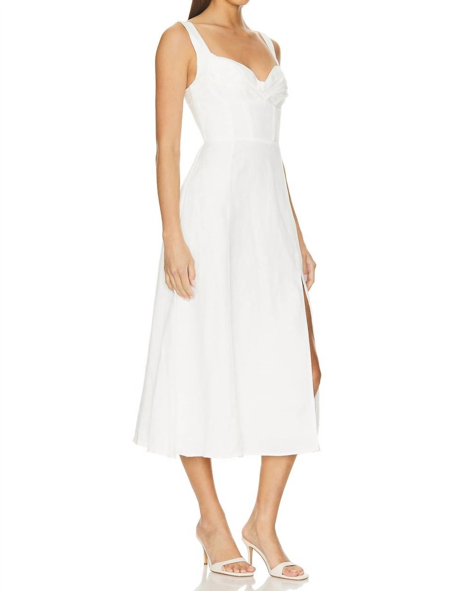Just add slides or mules and you are good to go. Elevate your holiday wardrobe with the Estella Midi Dress by ASTR, a chic choice in classic white. This sleeveless, A-line silhouette is crafted from a 55% linen and 45% viscose blend, with a fully lined interior of 95% polyester and 5% elastane. Made in China, it features a hidden side zipper closure for a seamless look. Care instructions recommend dry cleaning to maintain its elegance.