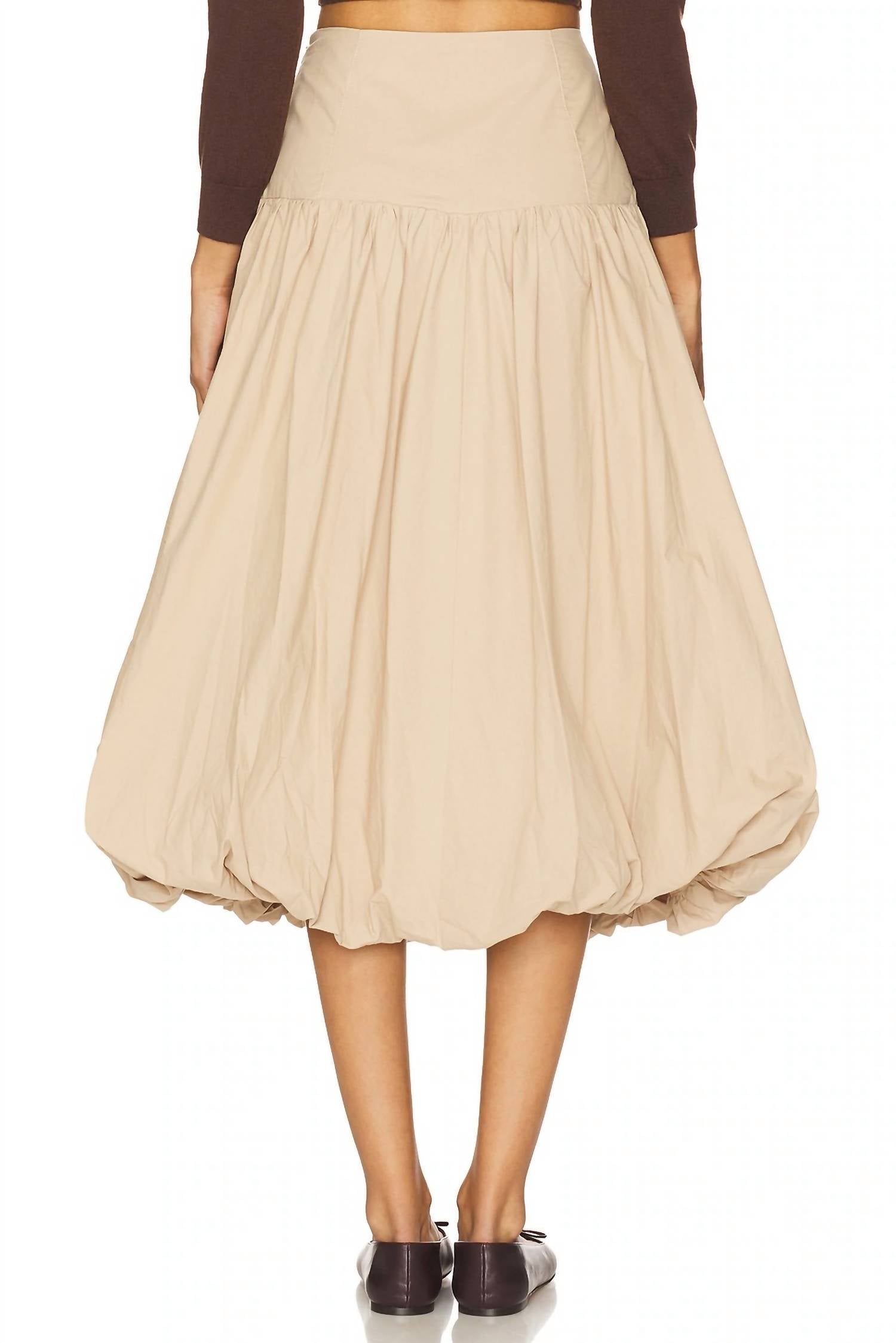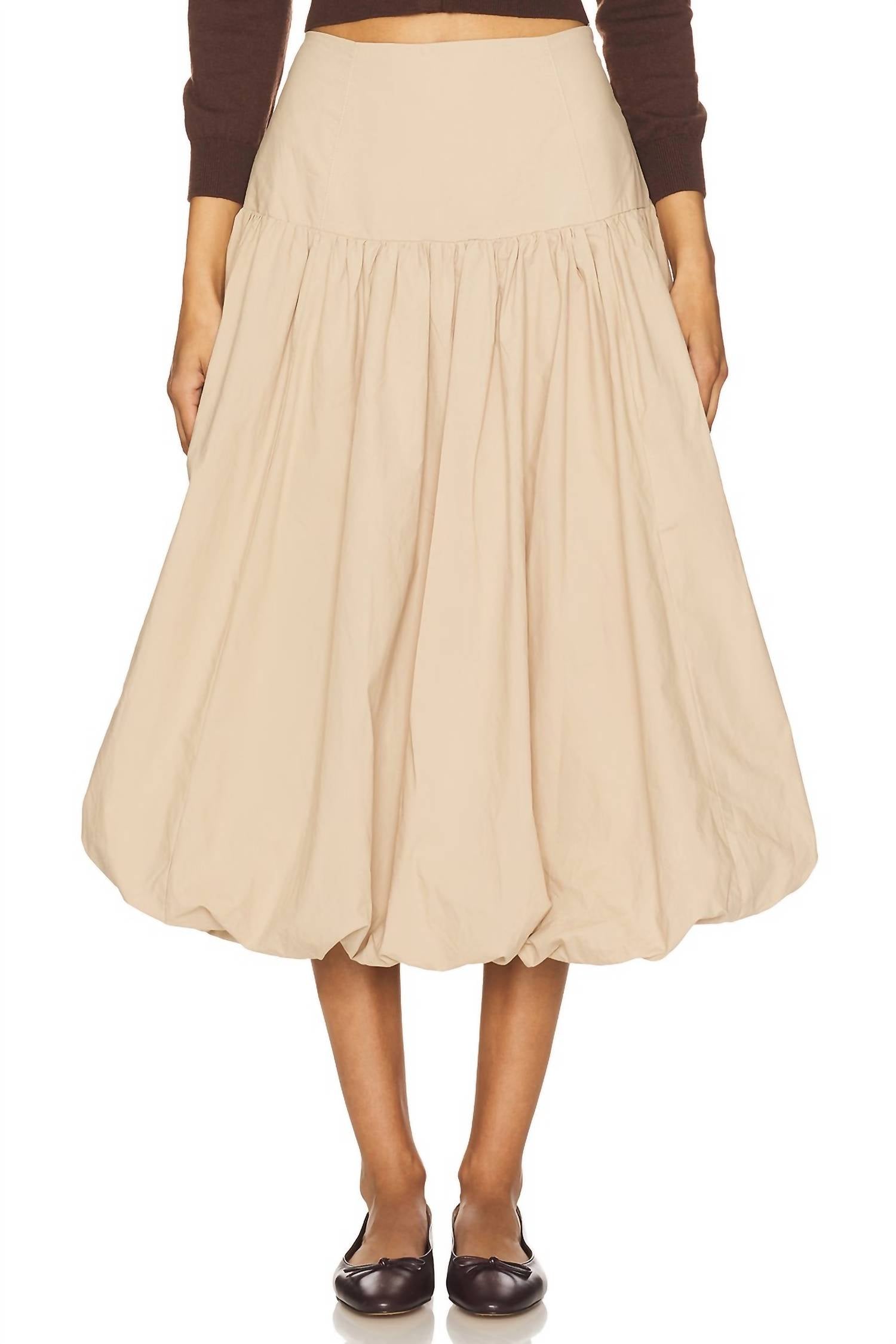 Introducing the Kia Drop Waist Bubble Hem Midi Skirt by ASTR in a sophisticated tan hue, perfect for minimalist spring styles and dinner parties. This skirt boasts a midi length with a fully lined interior for added comfort. Made from 100% cotton, it features a concealed side zipper for a streamlined silhouette. Care instructions recommend dry cleaning to maintain its structure and elegance.