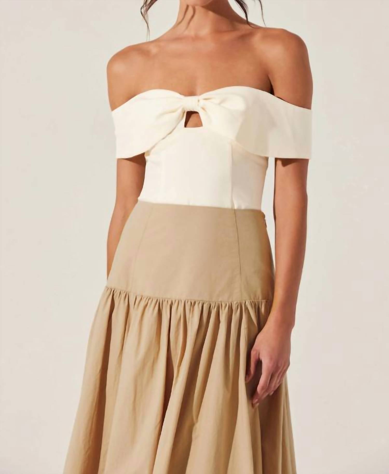 A versatile blouse that works from desk to dinner! Introducing the Telayna Off Shoulder Bow Top by ASTR, a stunning choice for your evening ensemble. This off-white blouse features short sleeves and a fashionable off-the-shoulder neckline, enhanced by a keyhole cutout at the bust. Crafted with a blend of 95% polyester and 5% elastane, it boasts a solid pattern and boning around the bodice for a refined fit. Closure: Concealed back zip. Care: Dry clean only. Perfect for a minimalist spring look at dinner parties or Thanksgiving gatherings.