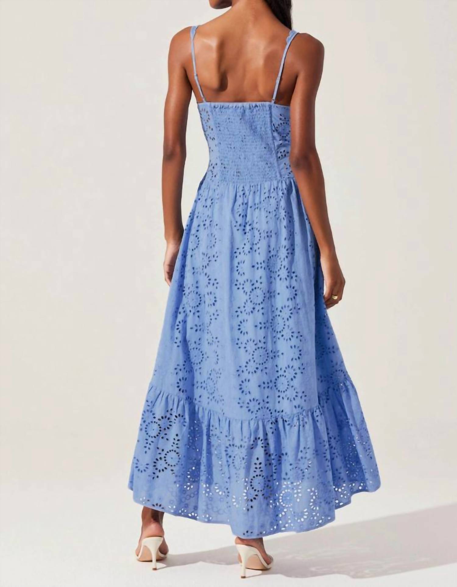 Embrace elegance with the Yamila Eyelet Corset Midi Dress by ASTR in a refreshing blue hue. This sleeveless dress is crafted from 100% cotton, offering breathable comfort perfect for summer occasions. It features a button closure and boasts a corset-inspired silhouette with a sweetheart neckline, detailed with intricate eyelet patterns for feminine charm. It requires dry cleaning to maintain its textured beauty, ideal for garden parties or Easter celebrations.