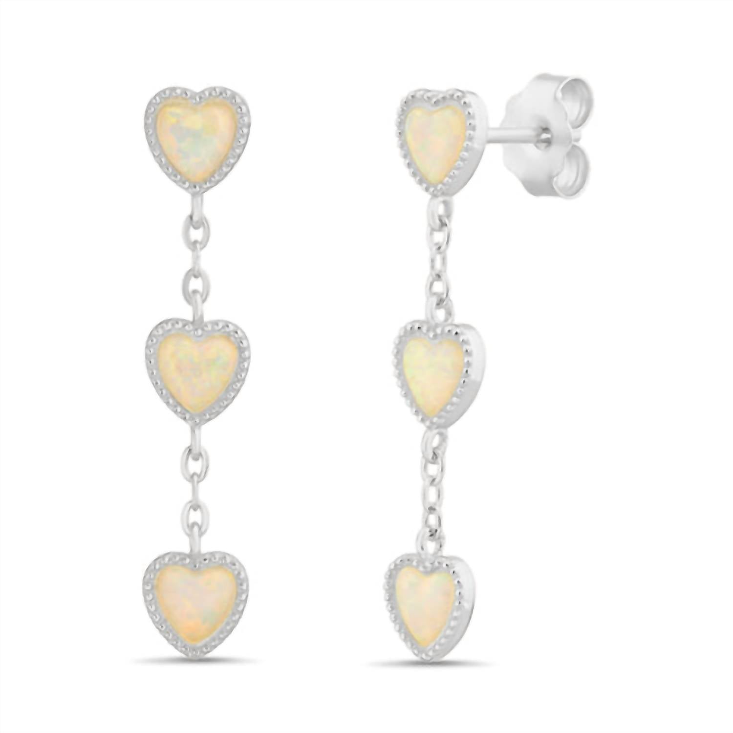 eye-catching earrings for every occasion. Elevate your style with the Women's Sterling Silver Opal Triple Dangling Heart Post Earrings by Atlanta Jewelers Supply. These fine earrings feature dazzling white opals set in sterling silver, offering a stunning triple heart design. Measuring 1" in height and 5mm in width, they add a touch of elegance to any outfit. Closure: Post.