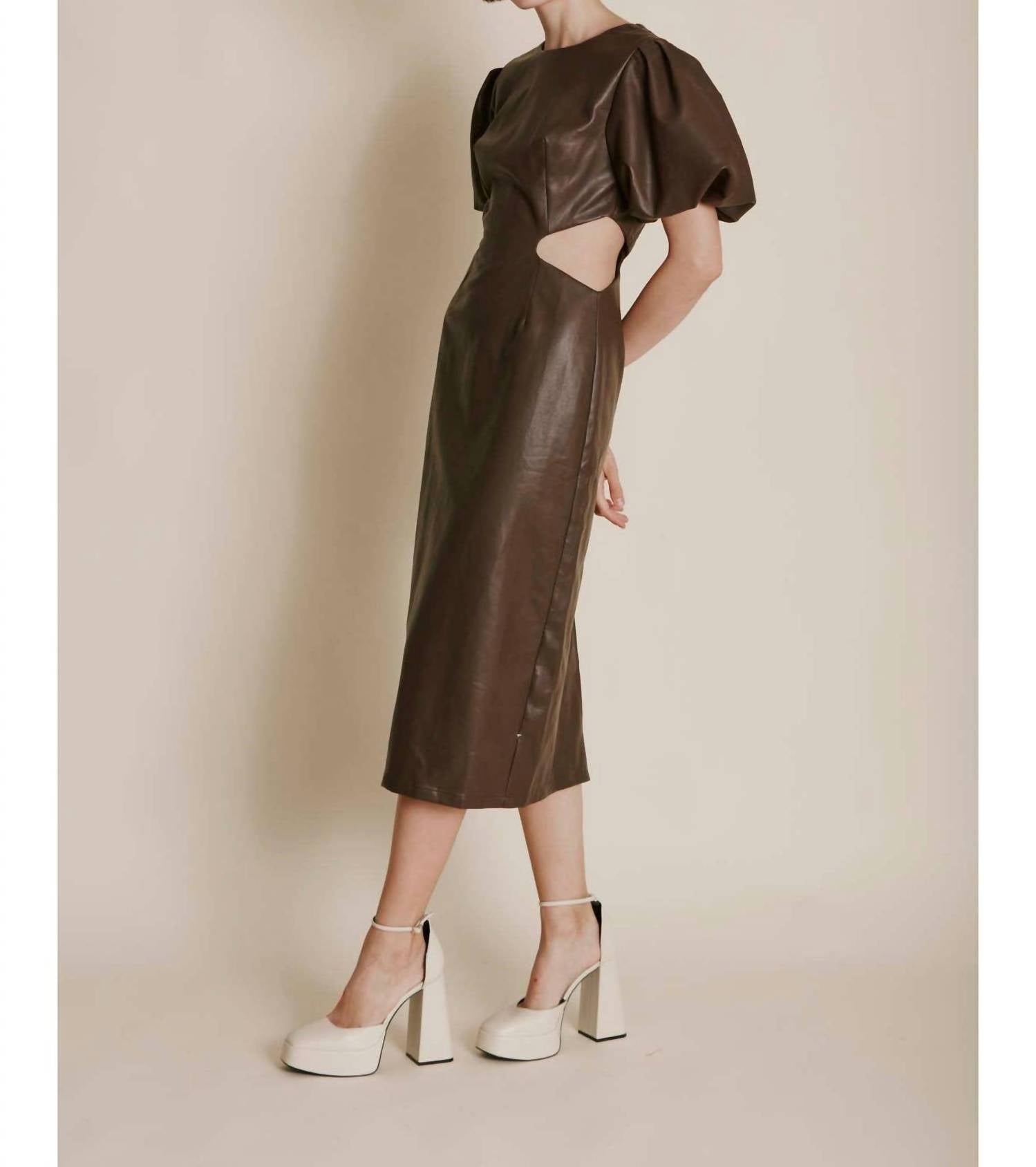 The perfect length dress does exist. Introducing the Vegan Leather Cut Out Midi Dress by Aureum, a sophisticated choice for spring in a warm brown hue. This women's dress features short bubble sleeves and a chic side cut-out detail, crafted from vegan polyurethane for an eco-conscious touch. Made in China, it offers a flattering midi length with a secure center back zipper closure. Hand wash for best results.