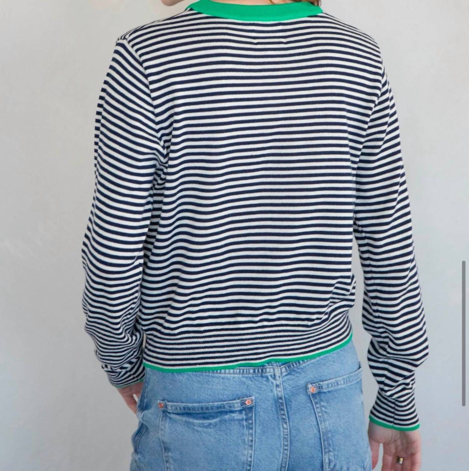 A classic fit that works just as good buttoned as it does left open. Chic addition to your winter wardrobe perfect for travel. Long sleeve women's cardigan in a classic navy stripe pattern features a crewneck design and vibrant green contrast trim. Crafted from soft, breathable knit. Offers all-day comfort with a versatile button closure for adaptable styling. Hand wash only.