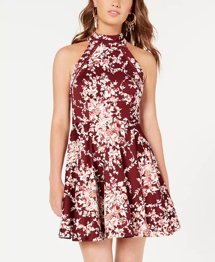 Concealed back zipper closure; keyhole double-button closure at back neck|Short length|Mock neckline; fit & flare silhouette|Crochet trim|Partially lined|Juniors' size XXS (00) = Women's XXS (00); Juniors XS (0-1) = Women's XS (0); Juniors S(3-5) = Women's S (2-4); Juniors M( 7-9) = Women's M (6-8)
