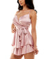 Sleek on top| flirty on the bottom. This B Darlin dress is ready to party with its shiny satin finish and waist-cinching tie.| Approx. 35 long from high point shoulder to hem. Length is based on size 7/8 and varies 1/4 between sizes| Fitted through the chest and waist; structured A-line skirt sits slightly over hips| Surplice neckline; A-line silhouette| Back zipper closure| Layered skirt; tie at waist