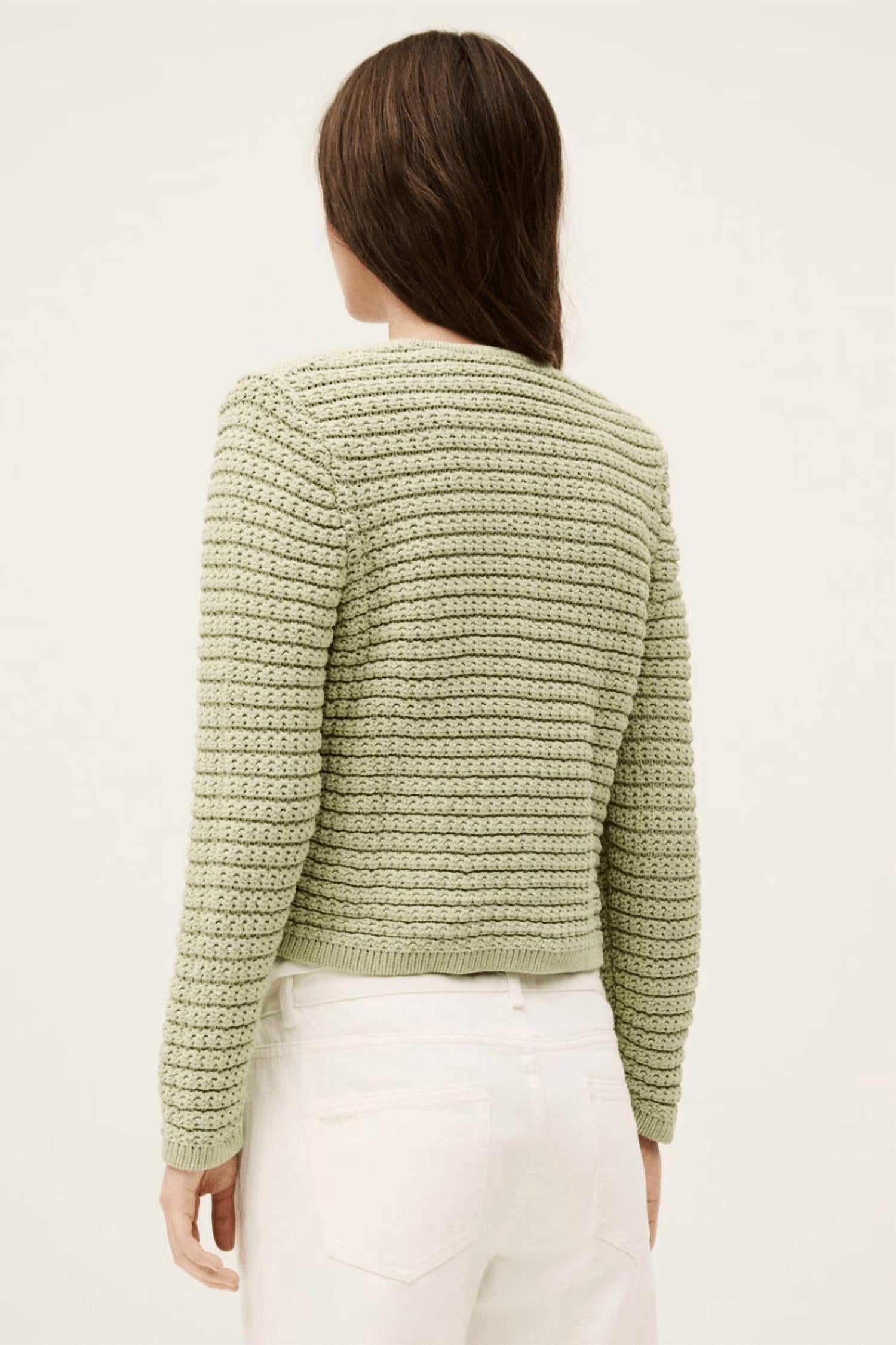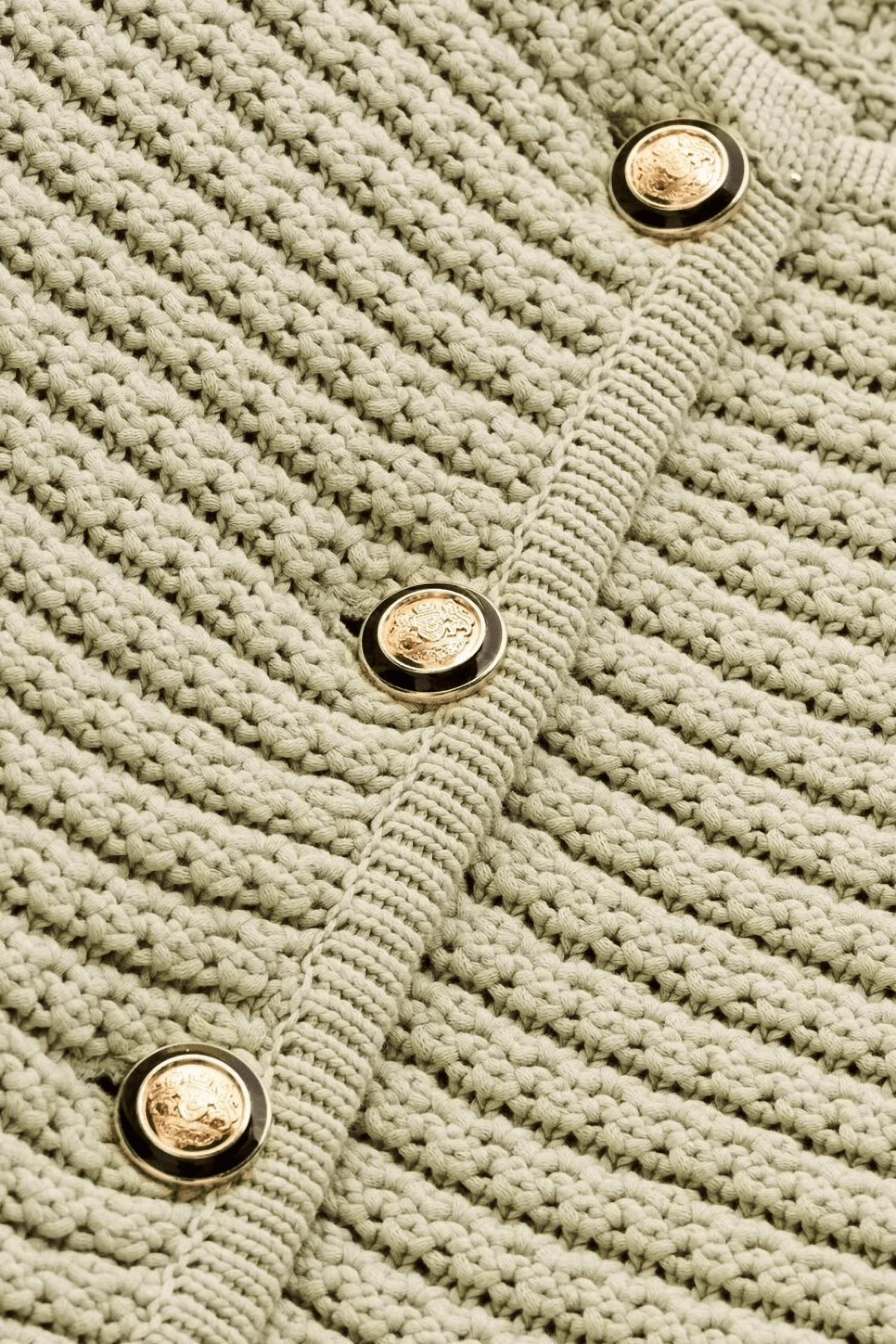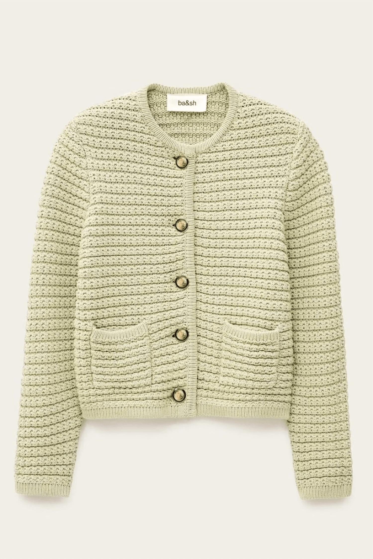 This cardigan will be a sweater-rotation favorite. Introducing the Gaspard Cardigan by ba&sh, a chic addition to your wardrobe in a timeless sage hue, perfect for a maximalist spring look. This women's cardigan features a round neckline with long sleeves, crafted from a comfortable blend of 75% cotton and 25% polyamide. Adorned with contrasting buttons and textured details, it boasts a boxy cut and practical patch pockets for added style and functionality. Closure: Button closure. Care: Machine wash, tumble dry recommended.