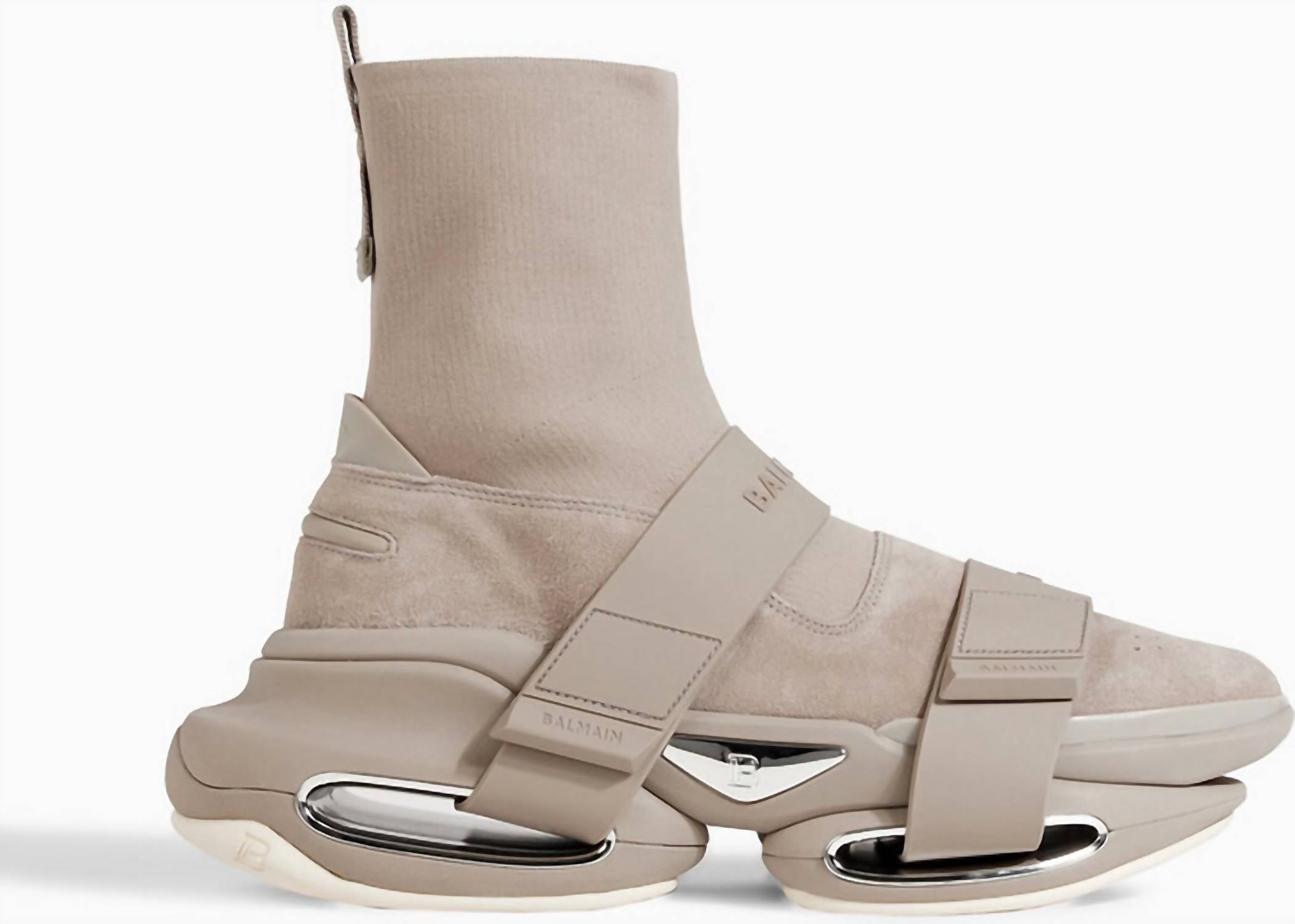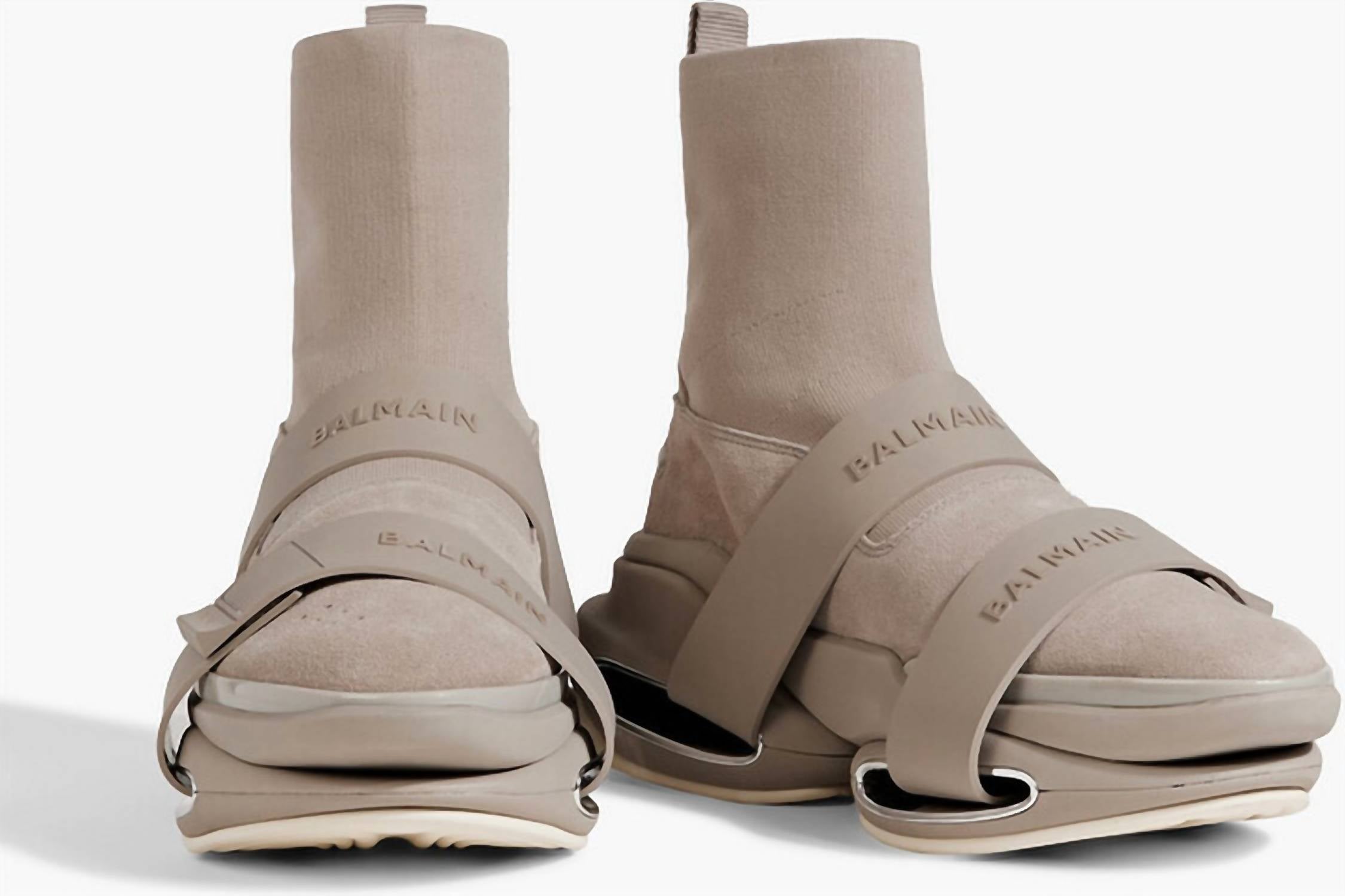 Discover the Men's B Bold Strap Knit and Suede High-top Sneakers by Balmain, a stylish addition to your collection in an elegant stone color. Crafted with a Flyknit and cow split suede upper, these sneakers feature sleek rubber and monogrammed trims. Designed with a round almond toe, they secure with a Velcro closure and are set on a durable rubber lug sole. Care: Wipe clean. Ideal for the fashion-forward man seeking both comfort and style.